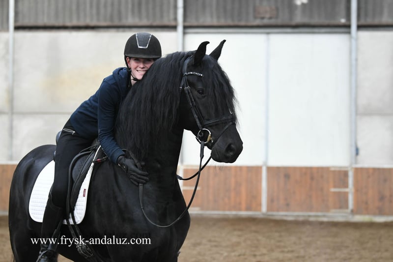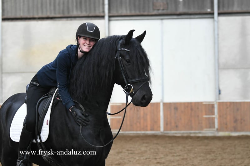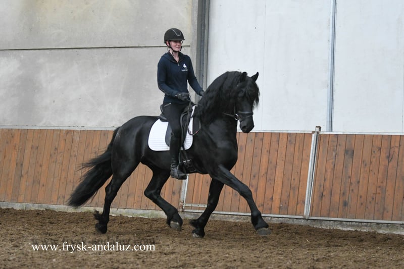 Upke Zoekt u een bloedmooi paard met super sportkwaliteiten? Een echte eye-catcher in de wedstrijding? Dan is Upke wellicht het juiste paard! Met zijn schitterende hoofd, lange volle bos manen, gitzwarte kleur, sterke bouw en top bewegingen is hij een paard die de show steelt. Upke is met recht een Ster hengst van bovengemiddelde kwaliteit die het ver heeft geschopt op de hengstenkeuring, hij liep namelijk in het Centraal Onderzoek en redde het maar net niet tot dekhengst. Upke is dus goed gereden onder het zadel, hij is een paard met een echte sportmentaliteit; heel makkelijk te rijden, denkt altijd vooruit en doet elke dag zijn uiterste best, hij is fijn gevoelig maar niet rillerig. Upke stapt met veel ruimte en tact, draaft bergop met veel ruimte en souplesse en galoppeert beter dan menig ander ras. Het is echt een heerlijk paard voor iemand die het beste van het beste wilt. In de omgang is Upke een betrouwbare en vriendelijke hengst, een paard die van aandacht houdt. Upke is dus het juiste paard voor iemand die het ver wilt schoppen in de dressuursport! https://www.frysk-andaluz.com/horse/upke-ster/ Are you looking for a strikingly beautiful horse with exceptional sporting qualities? A true eye-catcher in competition? Then Upke may be the right horse for you! With his magnificent head, long, full mane, jet-black colour, strong build and superb movements, he is a horse who steals the show. Upke is truly a Star stallion of above-average quality who has come a long way in the stallion inspection, as he competed in the Central Inspection and just missed out on becoming a stud stallion. Upke is therefore well ridden under saddle. He is a horse with a real sporting mentality; very easy to ride, always thinking ahead and doing his very best every day. He is finely sensitive but not skittish. Upke walks with great space and tact, trots uphill with great space and suppleness and canters better than many other breeds. He is truly a wonderful horse for someone who wants the best of the best. Upke is a reliable and friendly stallion, a horse who loves attention. Upke is therefore the right horse for someone who wants to reach the top in dressage!