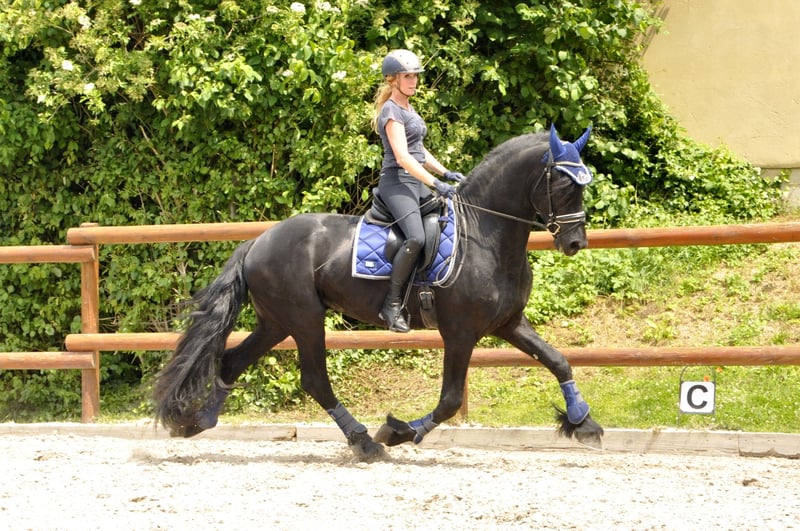 Un hermoso y grande frisón con una gran presencia y carisma. Tiene movimientos por encima de la media, está dispuesto a trabajar y colabora bien. Tiene un carácter amable y, debido a su disposición para aprender y su actitud hacia el trabajo, es adecuado para la doma. Está montado de acuerdo a su edad y también ha sido conducido a la carreta. ¡Las consultas solo por teléfono!