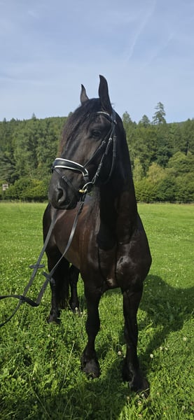 Pozitano aus dem Ohrnbachtal – beeindruckender junger Friesenhengst mit Herz, Mut und außergewöhnlicher Gelassenheit Rasse: Friese Abstammung: Haitse 425 × Pier 448 Geburtsjahr: 2021 Stockmaß: ca. 1,67 m Farbe: Rappe Standort: 64720 Michelstadt Preis: ... Unser selbstgezogener Friesenhengst Pozitano aus dem Ohrnbachtal ist ein Traum von einem Youngster: wunderschön, ausdrucksstark, unglaublich brav und mit einem Herzen aus Gold. Er wurde von uns liebevoll aufgezogen und mit viel Geduld und Feingefühl ausgebildet. Pozitano verfügt über drei sehr gute Grundgangarten, zeigt sich stets lehrwillig und arbeitet mit einem besonderen Engagement mit. Trotz seiner Hengstgene ist er extrem lieb im Umgang, höflich, unkompliziert und sucht immer die Nähe zum Menschen. Auf Turnier beweist er regelmäßig seine Nervenstärke: Er ist absolut unbeeindruckt von der Kulisse, macht keinen falschen Schritt und bleibt in jeder Situation verlässlich und konzentriert. Er hat Freude an der Arbeit, an neuen Lektionen und auch an kleinen Sprüngen. Auch im Gelände ist Pozitano sicher, mutig und entspannt – ob vorne, hinten oder mittendrin, er geht überall mit. Selbst außergewöhnliche Situationen meistert er mit Ruhe: flatternde Umhänge, Planen, Freihand-Reiten oder besondere Aufgaben, wie Steigen, unter dem Sattel – Pozitano bleibt stets cool und vertrauenswürdig. Daher eignet er sich auch super für als Showpferd. Im Training überzeugt er durch seine Lernbereitschaft: Er beherrscht Schenkelweichen, Traversalen, Angaloppieren aus Schritt und Halt und beginnt sich bereits schön zu versammeln. Fliegende Wechsel erlernt er aktuell. Sein großartiger Arbeitseifer macht jede Einheit zu einer Freude. Schmiede- und verladefromm, freundlich, klar im Kopf, talentiert und voller Herz – ein ganz besonderer Hengst, der jeden Tag aufs Neue begeistert. Für Menschen, die sich einen ehrlichen, mutigen und besonderen Partner wünschen, der sowohl emotional berührt als auch sportlich glänzen kann. Auf Wunsch kann er kastriert werden. Video auf Anfrage.