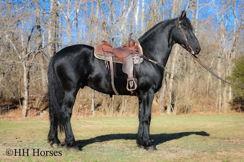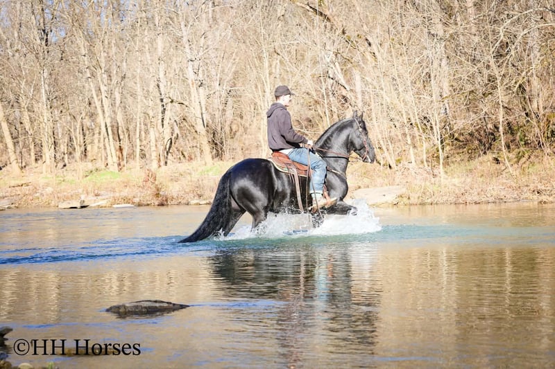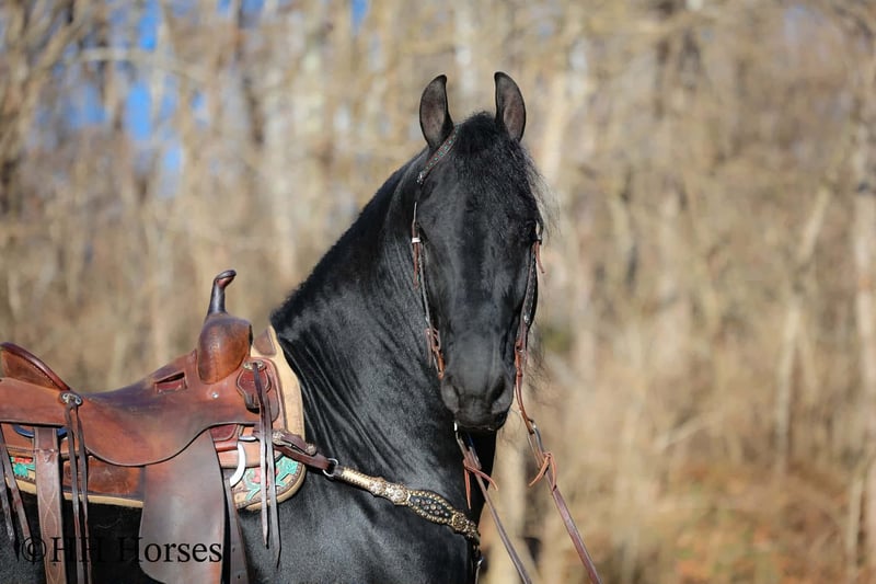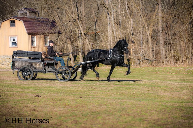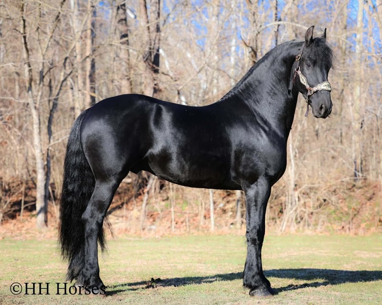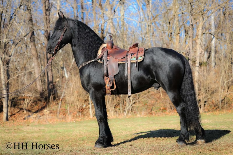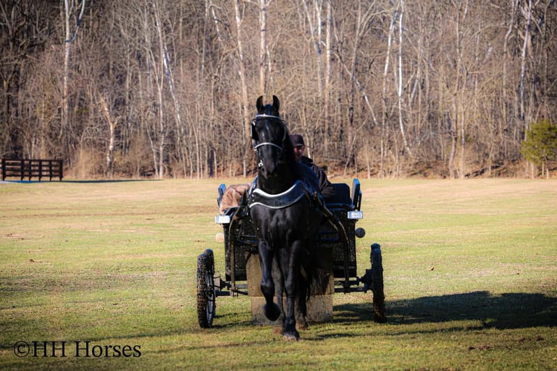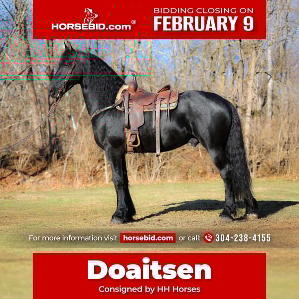 ❤️🔥𝑩𝒆 𝑴𝒊𝒏𝒆 𝐒𝐄𝐋𝐄𝐂𝐓❤️🔥 Happening now thru MONDAY | FEBRUARY 9th - Available EXCLUSIVELY on HorseBid's website! For more details and to register visit: www.Horsebid.com CONSIGNOR CONTACT: HH Horses 304-238-4155 LOCATION: Hillsboro , KY BREED: Friesan REGISTERED: Yes REGISTERED NAME: DOAITSEN'S IMAGE COLOR: Black HEIGHT: 16.2 AGE: 5 GENDER: Stallion This is "DOAITSEN'S IMAGE", a very attractive, handsome, and intelligent REGISTERED PUREBRED FRIESIAN STALLION that is well broke to ride and drive. He is 16.2 hands tall and 5 years old. This stallion has been shown, used in many stallion showcases, won many blue ribbons in the hitch classes, and been shown under saddle successfully as well. He is extremely well mannered for a stallion and has been trail ridden amongst mares and geldings with no fuss. He handles very quietly in the barn even when in very close proximity to other horses. He is a true gentleman with excellent ground manners. He stands tied, loads, bathes, and hauls. He is a proven breeder with a nice foal crop on the ground. He is an own son of "DOAITSEN 420". This nice stallion is very people oriented and he loves attention. He aims to please, will go anywhere you ask him to trail riding, and will lead or follow when riding in a group. He rides out alone with confidence bravely. You can keep him a stud and breed some mares or you can geld him and have a top notch gelding. He is the kind of stallion that makes owning a stallion easy. He is a gorgeous mover, has nice conformation, is smooth to ride, and has lots of action. Here is the chance to raise some spectacular Friesian cross babies and to have a talented, smart, and well mannered stallion. He's a kind horse that is easy to hitch, harness, tack, mount, groom, and ride. The purebred Friesian stallions are hard to find. We Can Help With Delivery Anywhere In The United States. Call or Text Erin at 304-238-4155