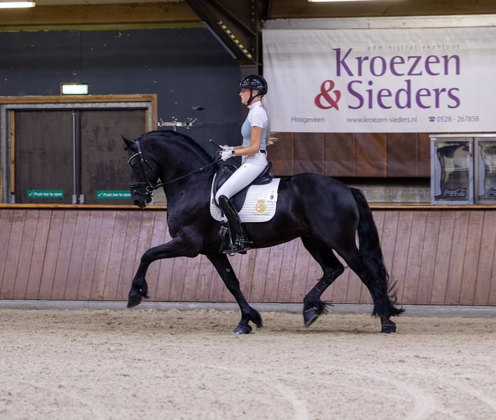 If you are looking for a very gentle, kind, and easy-to-ride sport horse, Oege from Cayenne Stables is truly exceptional. This Ster AAA stallion is among the best young Friesian sport horses of the moment, combining top-quality athleticism with a reliable and friendly temperament. He competes internationally for prizes and holds his own against warmblood dressage horses, demonstrating that he has all the qualities to continue progressing to a high level in dressage. Pedigree: Yme 507 x Beart 411 Breed and sex: Friesian stallion, Ster AAA Year of birth: 2019 Height: 165 cm (16.1 hh) Rider’s height in photo: 180 cm (5’11”) Location: Aalsmeer, Netherlands Studbook: KFPS Netherlands, Ster AAA Sport and Training Current level: Z2 Netherlands, S* Germany, Third Level USA In 2026, Oege will turn 6 years old and will compete in the FEI category for 6-year-olds, combined with participation in Z2 competitions. Training is focused on further refinement, strength development, and confirming his performances at national and international levels. Achievements - Champion of Friesian Dressage Horses - 6th place at the Dutch National Championships - IBOP score just under 90 percent - 4th place at CDI Tolbert Character Oege is exceptionally sweet, gentle, and trustworthy. He is very easy to ride, responsive to aids, and pleasant in daily handling. His work ethic and mental stability make him suitable for both professional riders and ambitious amateurs. In the arena, he demonstrates that he can consistently compete with top warmblood dressage horses. Health Clinically and fully radiologically approved, including legs, back, and neck. About Cayenne Stables At Cayenne Stables, we combine quality with personal attention and care for both horse and rider. We specialize in training, sales, and brokerage of high-quality dressage horses, with horse welfare always our top priority. We are not breeders and do not sell untrained horses or horses that have not yet reached an age-appropriate level of physical and mental development. Our horses are professionally guided over the long term by a dedicated team of trainers, veterinarians, farriers, and physiotherapists. Our advertisements aim to showcase our horses and our vision, not out of haste or necessity to sell, but based on trust in the right match at the right time. Contact: 📞 Mobile (call/WhatsApp): +31 6 81131407 | 📧 Email: info@cayennestables.nl 🌍 www.cayennestables.nl | 📸 instagram.com/cayennestables | 🌐 facebook.com/cayennestablesbv (EN) | 🇳🇱 facebook.com/cayennestables (NL)