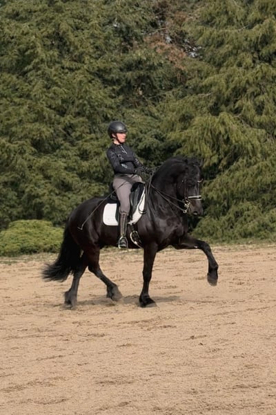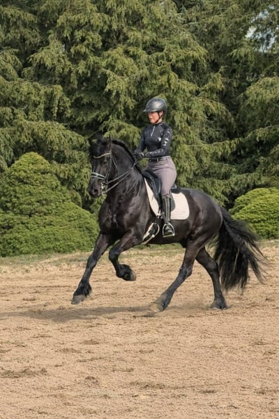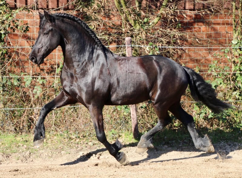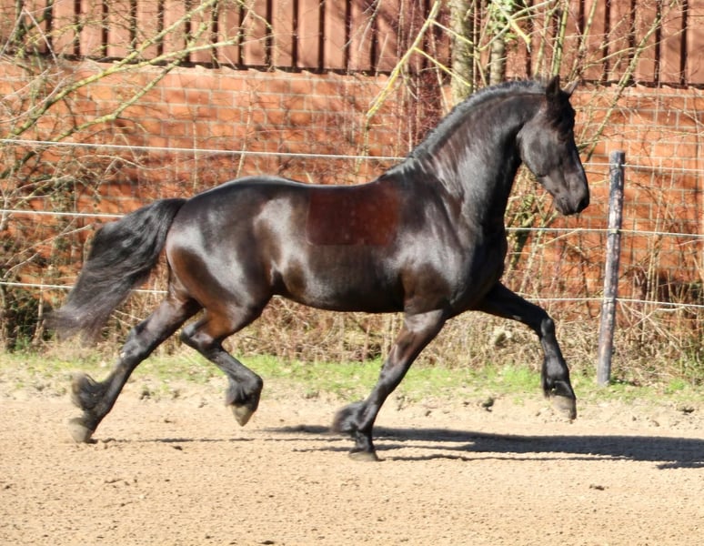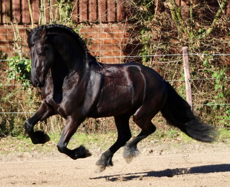 Zum Verkauf steht unser wunderschöner Friesenhengst Gouke fan Wettersicht, 8 Jahre alt, der durch seine Ausstrahlung, sein Talent und seinen einzigartigen Charakter begeistert. Gouke ist ein unheimlich charismatischer Hengst mit viel Ausdruck, einem tollen Bewegungsablauf und großer Präsenz. Trotz seines Hengstseins ist er beim Reiten absolut unkompliziert und zeigt sich jederzeit brav, motiviert und zuverlässig – null hengstig unter dem Sattel. Er ist bereits weit gefördert und sicher auf M-Niveau ausgebildet. Lektionen der Klasse M werden zuverlässig gezeigt. Die fliegenden Wechsel sind angelegt, jedoch noch nicht zu 100 % gefestigt. Darüber hinaus beherrscht Gouke bereits Piaffe, Passage sowie Spanischen Schritt, die er mit viel Ausdruck und Freude an der Arbeit präsentiert. Durch sein Talent, seine Rittigkeit und seine besondere Ausstrahlung eignet er sich sowohl für ambitionierte Dressurreiter auch für Liebhaber der Friesenrasse, die ein besonderes Pferd suchen. Gouke überzeugt nicht nur unter dem Sattel, sondern auch im täglichen Umgang durch sein freundliches und angenehmes Wesen. Bei ernsthaftem Interesse freuen wir uns über Ihre Nachricht und geben gerne weitere Informationen. Name: Gouke fan Wettersicht Rasse: Friese Alter: 8 Jahre Geschlecht: Hengst Ausbildungsstand: M-Dressur (Piaffe, Passage, Spanischer Schritt)