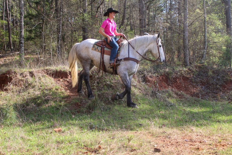 ⚜️𝓽𝓱𝓮 𝐆𝐎𝐋𝐃 𝓢𝓮𝓵𝓮𝓬𝓽⚜️ Happening now thru MONDAY | MARCH 23rd - Available EXCLUSIVELY on HorseBid's website! For more details and to register visit: www.Horsebid.com CONSIGNOR CONTACT: TR Livestock 605-370-4644 LOCATION: Rusk TX BREED: Friesian/Percheron cross REGISTERED: No COLOR: Gray HEIGHT: 16.2 AGE: 10 GENDER: Gelding Storm is a 10 year old gray draft cross (1/2 Percheron — 1/2 Friesian) gelding standing 16.2 hands tall. If you’re looking for a talented and steady crossbred, that is smart and always aims to please here he is! Storm has a lot of ability in the arena , he has smooth transitions and is good both inside and out! Storm is great on the trails, goes through water, different terrain and over obstacles. He has been used around cattle for being ranch work such as gathering, penning and even sorting! He will ride out alone or in a group and even has been rode in town! He stands tied, loads, bathes. He’s easy going and an easy keeper! Storm is a very unique cross with the large build and size of a Percheron and also the mind and beautiful movement of a Friesian making him a super cool cross to take to the show pen in the dressage or jumping! Or continue to use him on the ranch and the trails! If you’re looking for gentle as well as athletic ability in a draft cross that is easy to get along with here he is! Call or text TR Livestock 605-370-4644 (Rachel) for more info! Located in Rusk TX, nationwide shipping available!