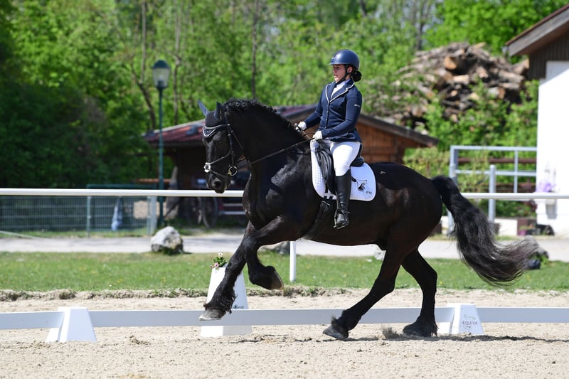 Lionel is an 11-year-old Friesian crossbreed standing at 1.74 meters at the withers. He not only has a striking appearance but also impresses with very good basic gaits. In daily work, he is very motivated and eager to learn. He has competed in several dressage and show jumping events and has been placed multiple times. Recently, he has primarily been competed in dressage. Lionel also enjoys groundwork, willingly goes out on hacks, and is familiar with some circus tricks such as bowing, lying down, Spanish greeting, and Spanish step. Lionel is not suitable for beginners, as he tends to test boundaries! In the herd, he ranks low despite his size, prefers to avoid stress, and enjoys his hay. He is very people-oriented and well-behaved in handling. Lionel is familiar with both box and open stable management. Currently, he is stabled in a box with daily turnout on pasture. He is a summer eczema (sweet itch) sufferer, but this is easily manageable. Otherwise, he is fit, has four shoes, is dewormed, and vaccinated against tetanus, influenza, and West Nile virus. Further details gladly provided upon serious inquiry! Feel free to contact me via WhatsApp.