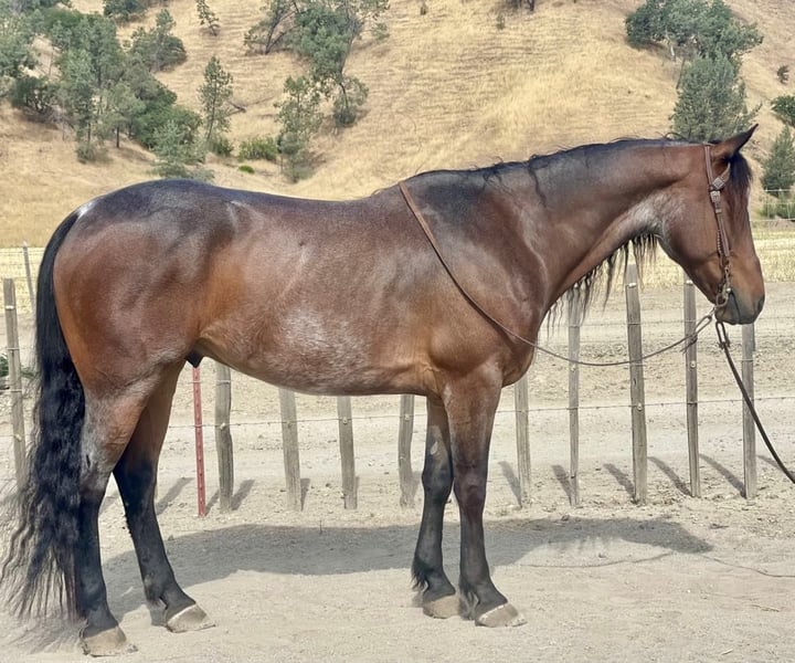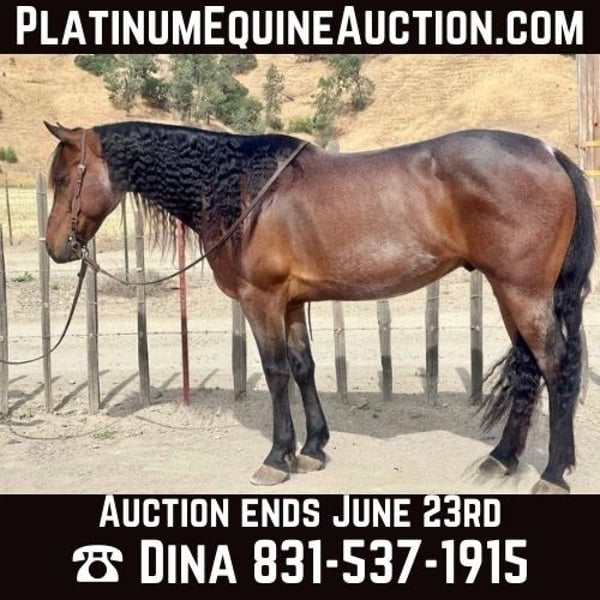 ONLINE AUCTION Place your bids at www.PlatinumEquineAuction.com Starting Bid $3500 Auction ends June 23rd, 2024 Need a new saddle? Check out White Rock Saddles on our website or Facebook! Tapatio is a friesian cross that stands 15 HH and is 10 years old. He is a roan gelding with a beautiful head, kind eye, and a long beautiful mane and tail. He is safe and honest for all riders. He takes time off well and comes back to work fully retaining everything he knows. Tapatio knows his arena work, side pass, bend flex, is soft in the face, takes both leads, extends out or collects up, etc. Tapatio has also had a lot of time riding outside, through pastures, trails, creeks, along busy highways. This gelding has elegant flowing movements in his gaits that makes him stunning under saddle. He will ride English or western. He has been ridden in several parades and does amazing. He is great with the tarp, flag and bouncing ball. He would excel in any way you would like to take whether it be the solid trail partner, arena work, or in the English equestrian riding. Tapatio has proven to be reliably consistent, kind and very easy to work with. He has so much potential to continue with in many different directions. He has wonderful ground manners. He stalls nicely or gets along in a herd in pasture. Tapatio ties, cross ties, clips, bathes, is great for the vet and farrier, and has great manners around other horses. He has no special care of any kind, no maintenance needed. Tapatio is clean legged, has great feet is currently barefoot and he also has been shod. If you like to come meet this exquisite gelding or have question please don’t hesitate to contact Longhorn Ranch Dina 831-537-1915 Located in Paicines, CA. ONLINE AUCTION Place your bids at www.PlatinumEquineAuction.com Starting Bid $3500 Auction ends June 23rd, 2024 Need a new saddle? Check out White Rock Saddles on our website or Facebook!