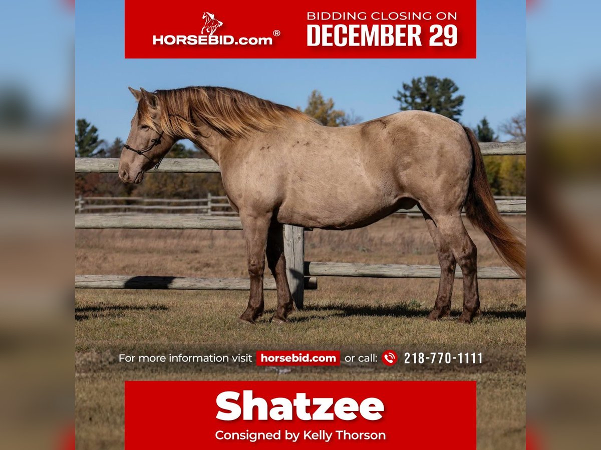 ⚜️ 𝓗𝓮𝓻𝓲𝓽𝓪𝓰𝓮 𝐖𝐢𝐧𝐭𝐞𝐫 𝓒𝓵𝓪𝓼𝓼𝓲𝓬⚜️ Happening now thru MONDAY | DECEMBER 29th - Available EXCLUSIVELY on HorseBid's website! For more details and to register visit: www.Horsebid.com CONSIGNOR CONTACT: Kelly Thorson 218-770-1111 LOCATION: Nevis, MN BREED: Friesian Heritage Horse and Sporthorse International REGISTERED: Yes REGISTERED NAME: Doubly Shatzee LW COLOR: Champagne HEIGHT: 15 AGE: 12 GENDER: Gelding Shatzee is a 15-hand registered Friesian Sport Horse gelding with a truly unique champagne color that draws attention wherever he goes. His striking look is matched by a solid, substantial build, with plenty of foot and bone to hold up for years to come. He has the kind of size and structure that gives confidence both on the ground and in the saddle. Under saddle, Shatter is an excellent trail horse. He is confident, steady, and uncomplicated, making him enjoyable to ride in a variety of environments. Whether you’re heading out for a quiet ride or covering more ground, he stays relaxed and dependable, allowing his rider to simply enjoy the experience. In the barn and around the ranch, Shotzi is extremely gentle and safe. He is kind-natured, easy to handle, and a pleasure to be around on a daily basis. His calm demeanor and willing attitude make him an easy fit for a wide range of riders looking for a horse they can trust. With his rare color, durable build, and quiet, reliable nature, Shatzee is a hard-to-find combination. He’s the kind of horse that stands out in the pasture and delivers peace of mind every time you swing a leg over him.