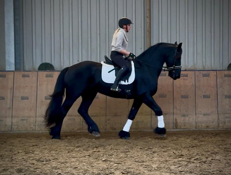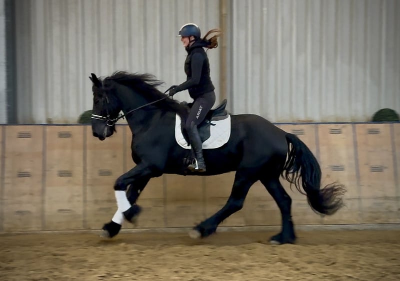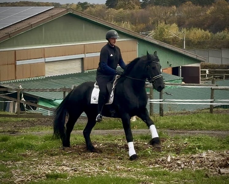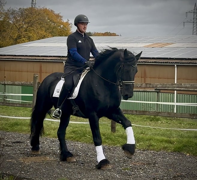 Name: Pol Breed: Friesian Sex: Gelding Date of Birth: April 10, 2013 Age: 12 years Height: 16.1 hh Color: Black (Rappe) Pedigree: Available Temperament: People-oriented, reliable, patient, curious, intelligent, brave, eager to learn Training/ suitability: Riding, Dressage, Leisure riding, Baroque riding Trail Experience: Dependable, experienced both alone and in a group Health: Dewormed, vaccinated, barefoot, eczema-free, teeth checked, osteopathically treated Stabling: Box stall, open stable Special features: Very good, expressive gaits; farrier and loading-friendly; herd-compatible; suitable for tandem driving The above characteristics are based on our personal assessment and do not constitute guaranteed traits. Price: €11,900 (gross price) Have we sparked your interest? To give you a better impression of Pol, we are happy to send you a video of him riding. Of course, we are available for a detailed description of the horse, personal consultation, and to answer all your questions by phone. Please feel free to contact us anytime via WhatsApp or call us at: +49 151 19487595 Our phone hours are daily from 7:00 to 13:30 and again from 20:00 onwards. We look forward to hearing from you! A clinical or radiological pre-purchase examination can be performed by your veterinarian of choice. Pol can be safely and comfortably delivered to his new home. We take care of all necessary preparations and transport so that your new horse arrives stress-free, well cared for, insured, and in good health. Currently, we offer a carefully selected variety of horses for sale. With us, you are guaranteed to find your dream horse. Feel free to visit us on our homepage: www.marvinsroyalhorses.de. Dear customers, we are happy to introduce you to our horses and offer grooming, tacking, lunging, ground work, and trial riding in the riding hall, on the arena, or in the field to help you get to know your new family member better. This costs €40 per horse; each additional horse €30, and the fee will be refunded upon purchase. Our address: Ferdinand Grube 50 53577 Neustadt-Wied Google Maps: marvinsroyalhorses