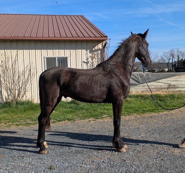 Introducing Sir Dunkin for your consideration!👀🏡 Bridgewater VA Coming 2 year old, ~16hh, Friesian cross gelding. UTD on vaccines and has a current coggins. Dunkin was rescued 2 months ago and has been in training for 1 month now. He has come a long way in his training and has most of the basics down. He is turning out to be a very cool guy and would be a great project for an experienced rider working with a trainer. He is very sweet, intelligent, and handsome!🤩 He thinks everything through and even though he has some firm boundaries, I have yet to find something that he refuses to do. With time, patience and once you have his trust he is willing to try just about anything. He would make a ✨great dressage prospect and is super athletic! He has lovely movements with lots of suspension and flash.✨ While he is safe to handle, he does need an experienced handler due to the fact that he is young and green. He needs someone who knows what they are doing when it comes to youngsters and someone who knows when to push and when to take the pressure off. He is the sweetest boy and always tries his best. You can see his entire journey on my social media Journey of a Hart Horse. He is one that I wish I could keep in my personal herd!! Message me for more information/videos.