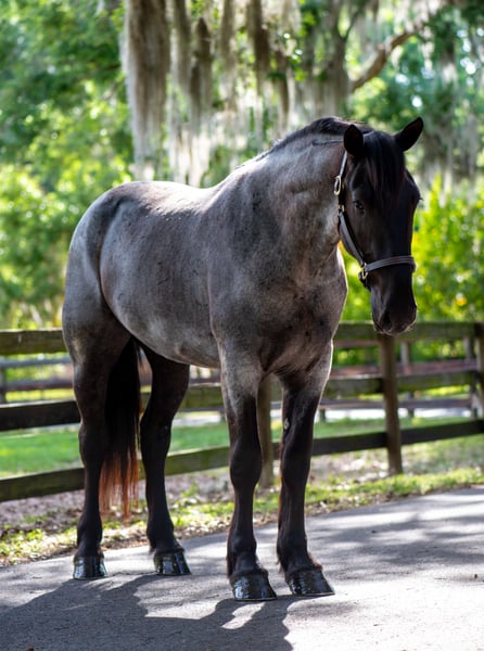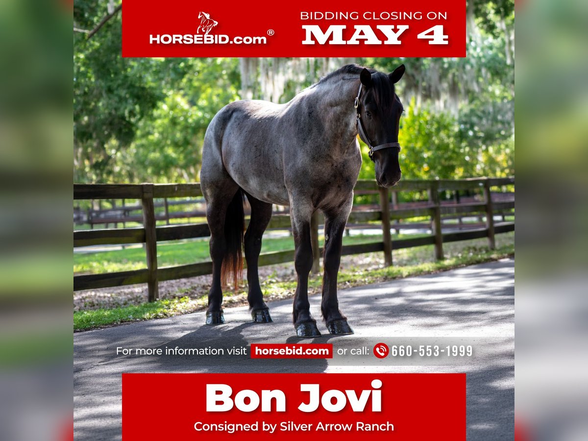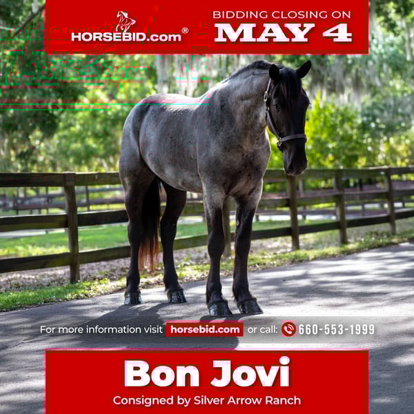 ▪️▫️◾️𝐭𝐡𝐞 𝑴𝒂𝒚 𝐒𝐞𝐥𝐞𝐜𝐭◾️▫️▪️ Happening now thru MONDAY | MAY 4th - Available EXCLUSIVELY on HorseBid's website! For more details and to register visit: www.Horsebid.com CONSIGNOR CONTACT: Silver Arrow Ranch 660-553-1999 LOCATION: Ocala, FL BREED: Friesian cross REGISTERED: No REGISTERED NAME: Bon Jovi COLOR: Blue Roan HEIGHT: 16.1 AGE: 3 GENDER: Gelding ✨ Bon Jovi – Livin’ on a Dream… and Ready for You ✨ Shot through the heart? It might just be once you meet Bon Jovi. This eye-catching 3-year-old blue roan gelding is the kind that makes you stop and stare—but it doesn’t take long to realize he’s so much more than just a pretty face. Bon Jovi is the perfect mix of talent, brains, and a willing, feel-good attitude that makes every ride something to look forward to. For such a young horse, he’s already done it all. He’s been ridden Western, English, and bareback, has gone cross country, out on trail rides, and has been off property seeing the world. New places and new experiences don’t faze him—he takes everything in stride like he was born to do it. Bon Jovi is smart, trainable, and wants to please. He’s the kind that meets you halfway and gives you that “this is easy” feeling every time you ride. And just for a little extra fun—he’s even trained to lay down on command, showing off both his trust and willingness in a way that always turns heads. On the ground, he’s just as lovable—kind, respectful, and easy to be around. The type you’ll find yourself humming a tune about on the way to the barn because you know he’s waiting. At just 3 years old, he’s only getting started—but he’s already well on his way to being someone’s once-in-a-lifetime partner. xrays and ppe on file