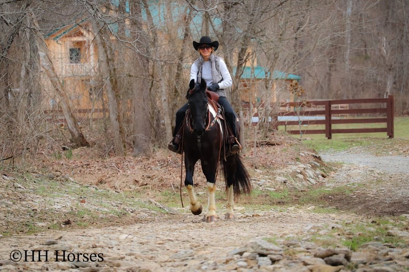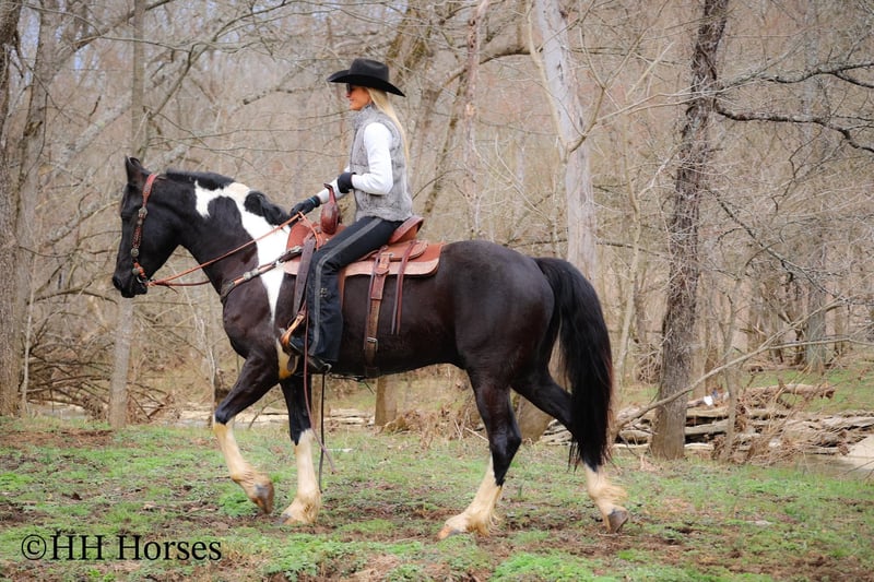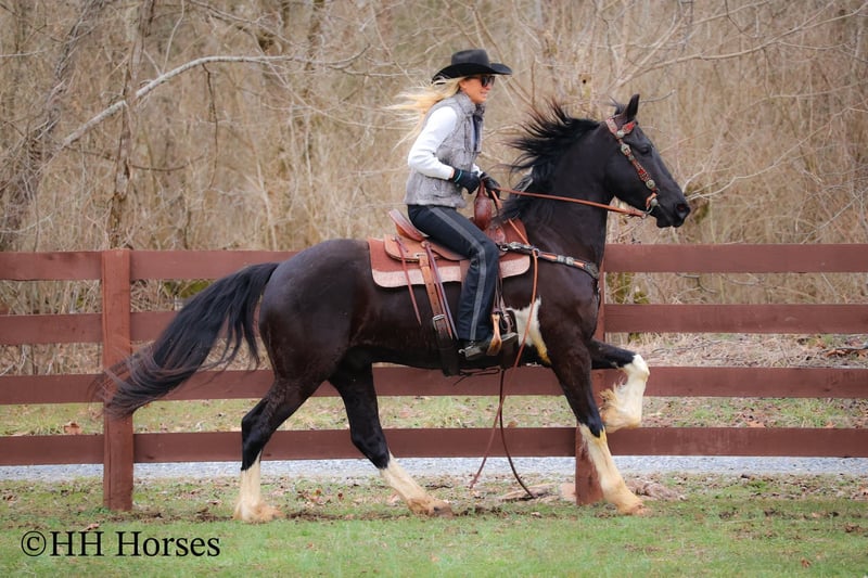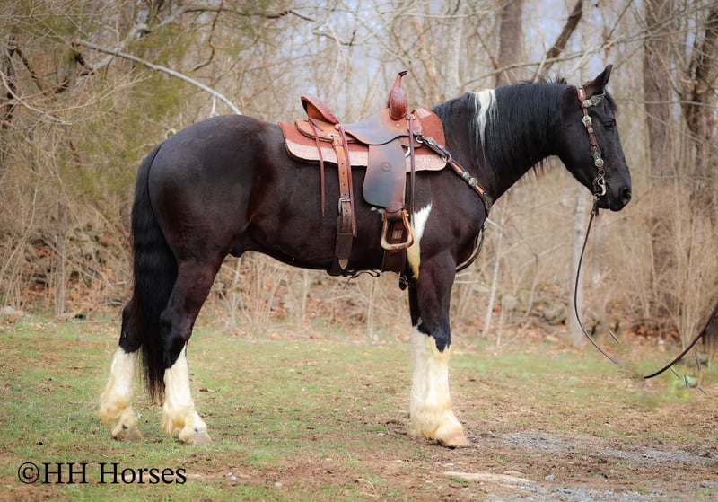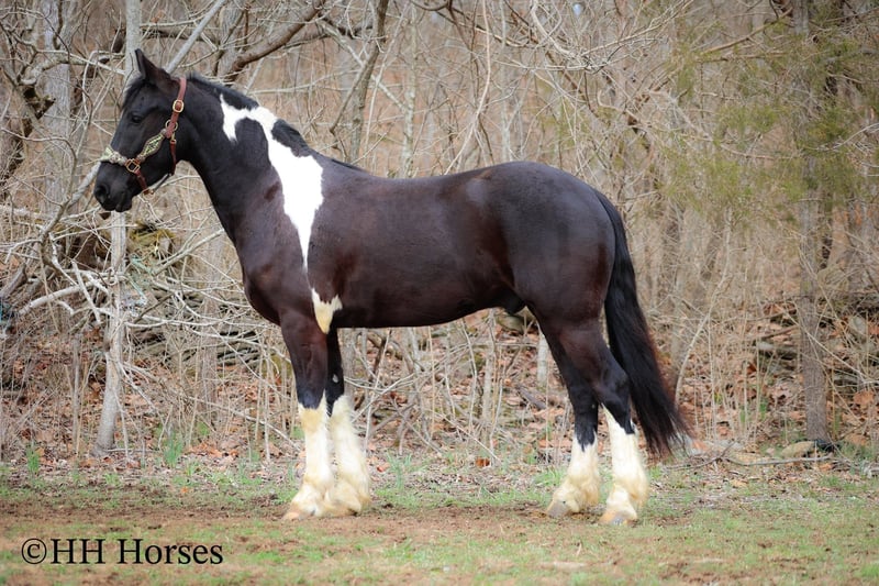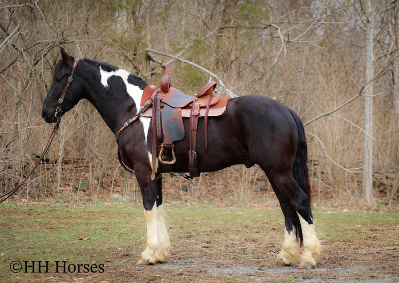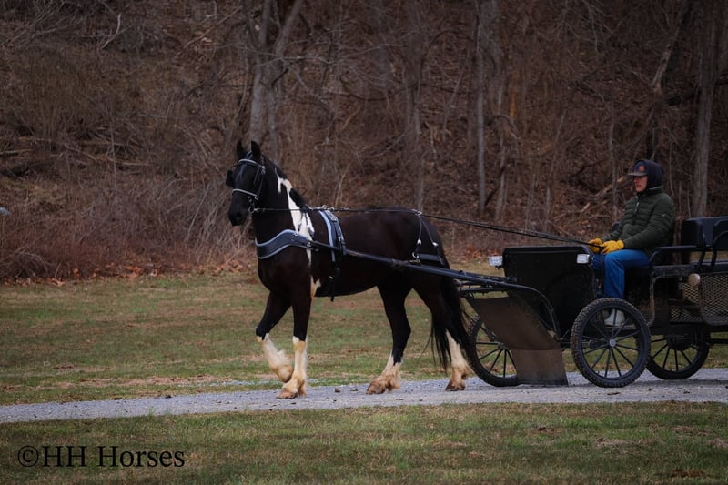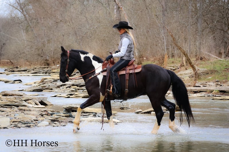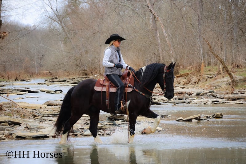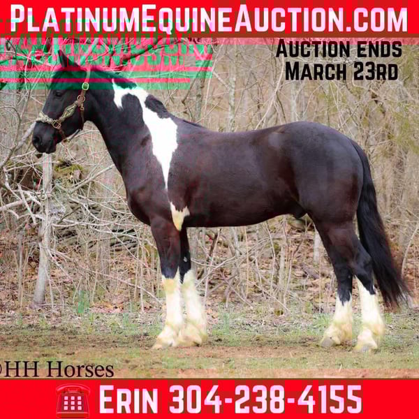 ONLINE AUCTION Place your bids at www.PlatinumEquineAuction.com Starting Bid $3500 Auction ends March 23rd, 2025 Need a new saddle? Check out White Rock Saddles on our website or Facebook! This is “PVF ROCKET”, a stunning BLACK AND WHITE REGISTERED FRIESIAN SPORT HORSE GELDING broke to ride and drive. This gelding is a handsome 15.2 hands tall. He is 4 years old and has had professional training. This nice gelding will lope circles, catch his leads, neck rein, and stop on whoa. He has been trail ridden and been through deep water, rocky stream beds, and big timber. He is well trained and well mannered. He is respectful of your space and moves off of leg cues. He has been hitched and driven to a cart and wagon. He has been through the cross country driving courses. He is traffic safe, not spooky, and he is obedient. This gelding has lots of heart, style, and presence. He is a very fun horse to ride with lots of feel in the bridle and on his ribcage. He is responsive, collected, and cool. Located in Flemingsburg, KY. For more info or to make a Buy It Now Offer contact HH Horses Erin 304-238-4155 ONLINE AUCTION Place your bids at www.PlatinumEquineAuction.com Starting Bid $3500 Auction ends March 23rd, 2025 Need a new saddle? Check out White Rock Saddles on our website or Facebook!
