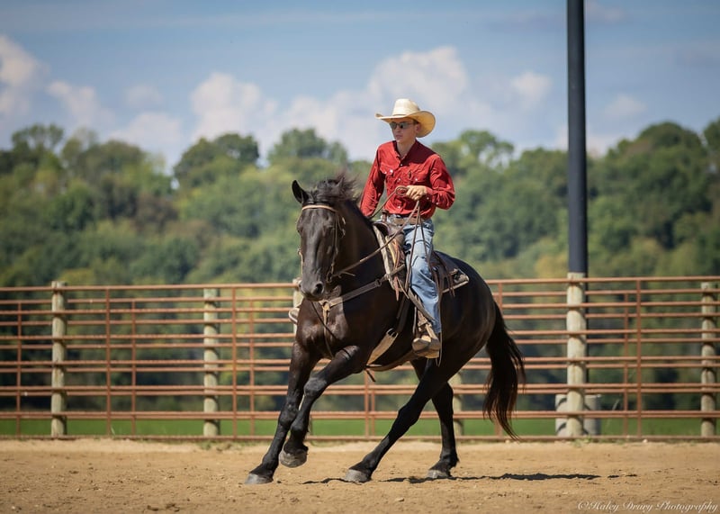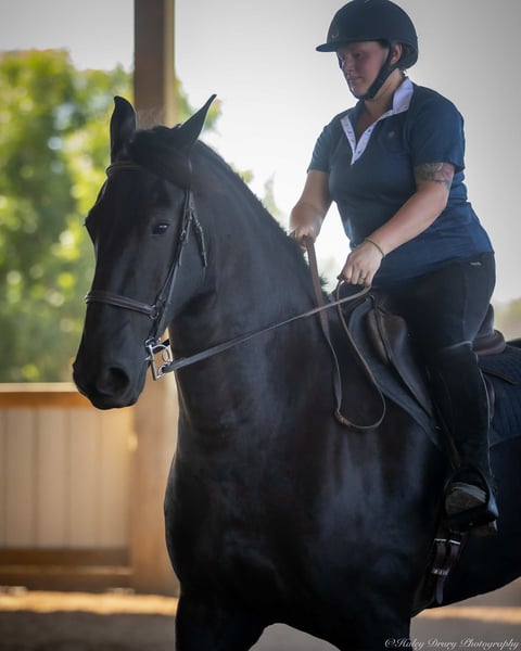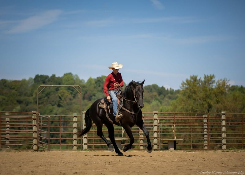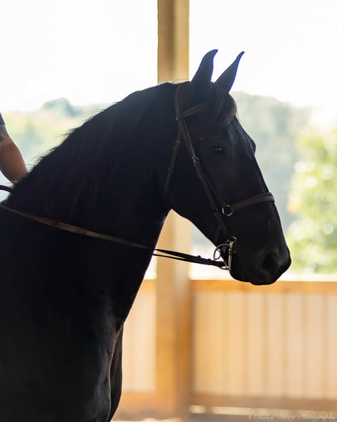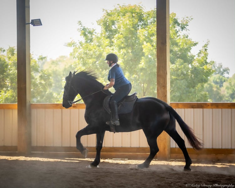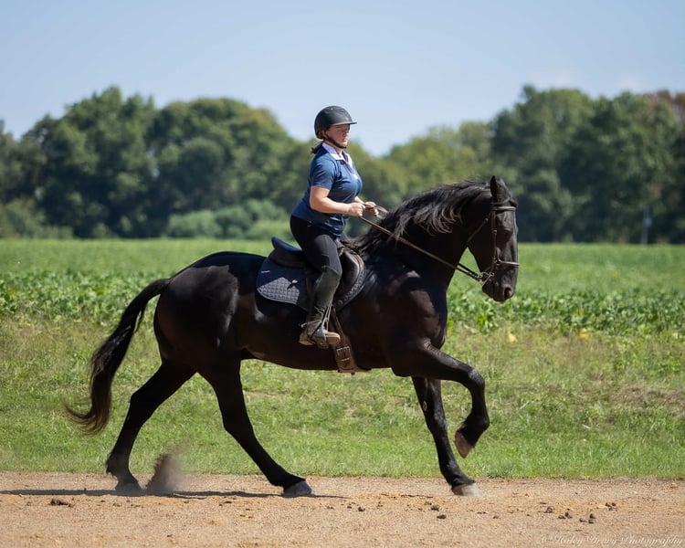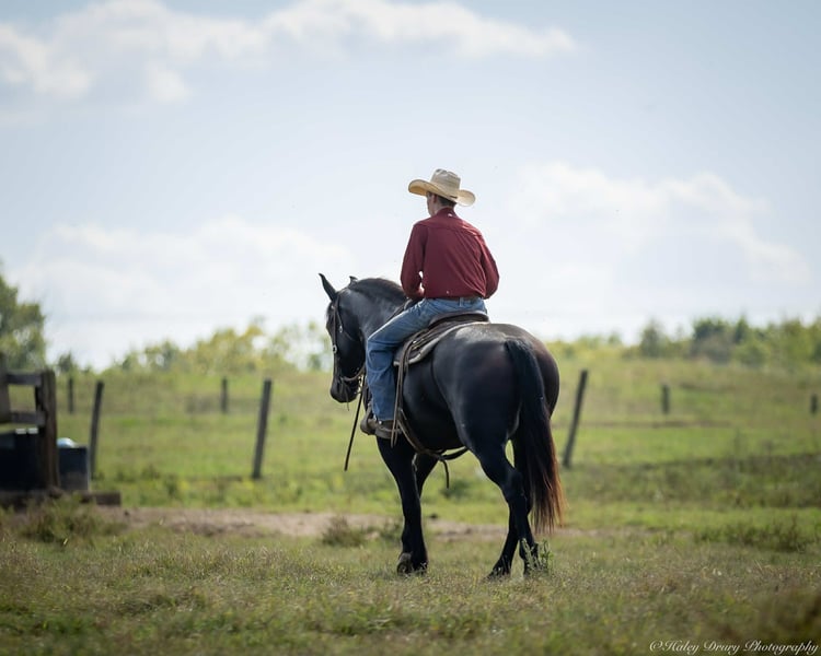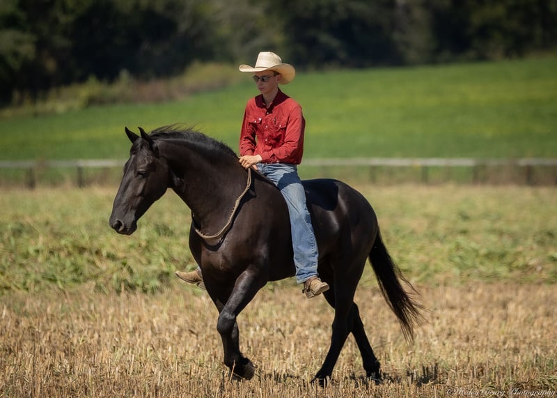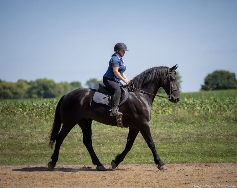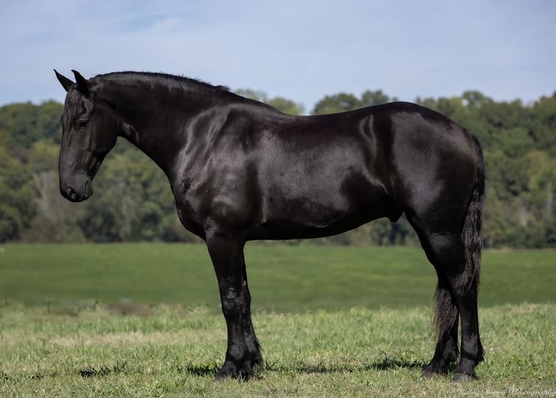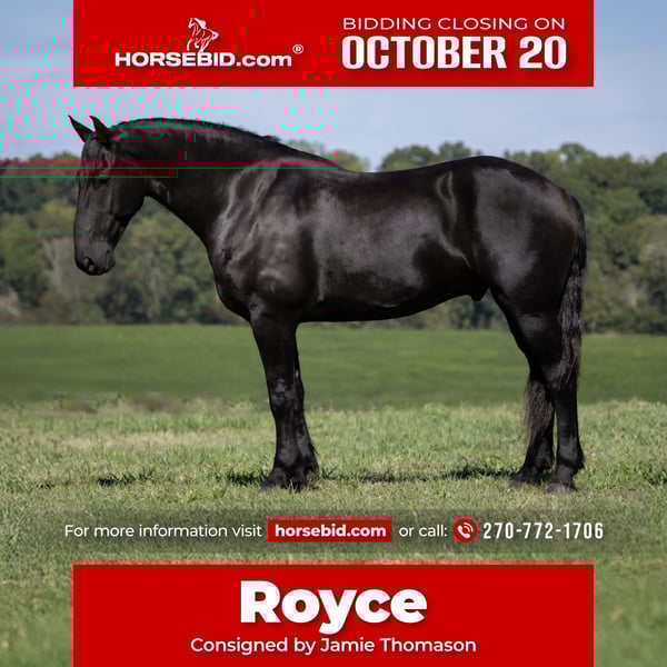 ♦️ 𝐭𝐡𝐞 𝐀𝐌𝐄𝐑𝐈𝐂𝐀𝐍 𝓕𝓪𝓵𝓵 𝓒𝓵𝓪𝓼𝓼𝓲𝓬 ♦️ Happening now thru MONDAY | OCTOBER 20th - Available EXCLUSIVELY on HorseBid's website! For more details and to register visit: www.Horsebid.com CONSIGNOR CONTACT: Jamie Thomason 270-772-1706 LOCATION: Auburn, KY BREED: Friesian Cross REGISTERED: Yes REGISTERED NAME: BIRCH FARM TED COLOR: Black HEIGHT: 16.3 AGE: 4 GENDER: Gelding The definition of equine luxury — a striking, jet-black, gelding with the size, style, and presence to turn heads! ROYCE is a 4 yr old, 1/2 Friesian, 1/4 Morgan, 1/4 Percheron Gelding registered in the Friesian Heritage Horse association, standing at 16.3 hands tall. Royce walk-trot-canters both directions, picks up the correct leads. Transitions smoothly, moves laterally, light in the bridle, & stops from your seat or a simple “whoa”. Royce is always willing, eager to learn, & forgiving making him suitable for a variety of riders and disciplines. No saddle, no bridle, no problem! Climb on and enjoy a leisurely stroll. Royce still stops, still steers, & still walk, trot, canters with nothing more than leg aids & a rope around his neck! On the trail, Royce hacks out alone or in a group. Content to lead or follow. Crosses water, goes up & down inclines, over bridges, through wooded paths, and across open pastures. Royce is easy to load, haul, and is unbothered in new settings. Myself, my daughter & her friends have taken him along to State & National Parks on day rides, he is unbothered by wildlife, hikers, and other passing riders. Always a fun time! On the farm, Royce has worked along stock dogs to move cattle. He’s ridden along side tractors, combines, atv’s, and other machinery without issue. He is traffic safe, gun safe, unbothered by waving tarps, and proudly carries the flag. Safe & seasoned around kids, dogs, cattle & other livestock. At home, Royce is exceptional. A gentleman on the ground, respectful on the lead, stands tied, cross tied, and is a very personable horse. If Royce is in the pasture, he’ll follow right behind me to the barn. My toddler is typically along for chores and Royce is always careful. He lowers his head for my son give him a pat and is extremely tolerant of a wild little boy in the barn. Royce has zero stall vices, always neat & tidy. Also perfectly content outside alone or in a mixed herd. Whether you're looking for a reliable partner for everyday riding or a head-turner with a calm, willing attitude, Royce is the kind of horse you don’t come across often. A true gentleman ready for his next adventure! If you would like to meet Royce prior to adding him to your family or have any other questions, feel free to reach out!