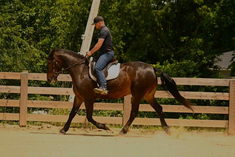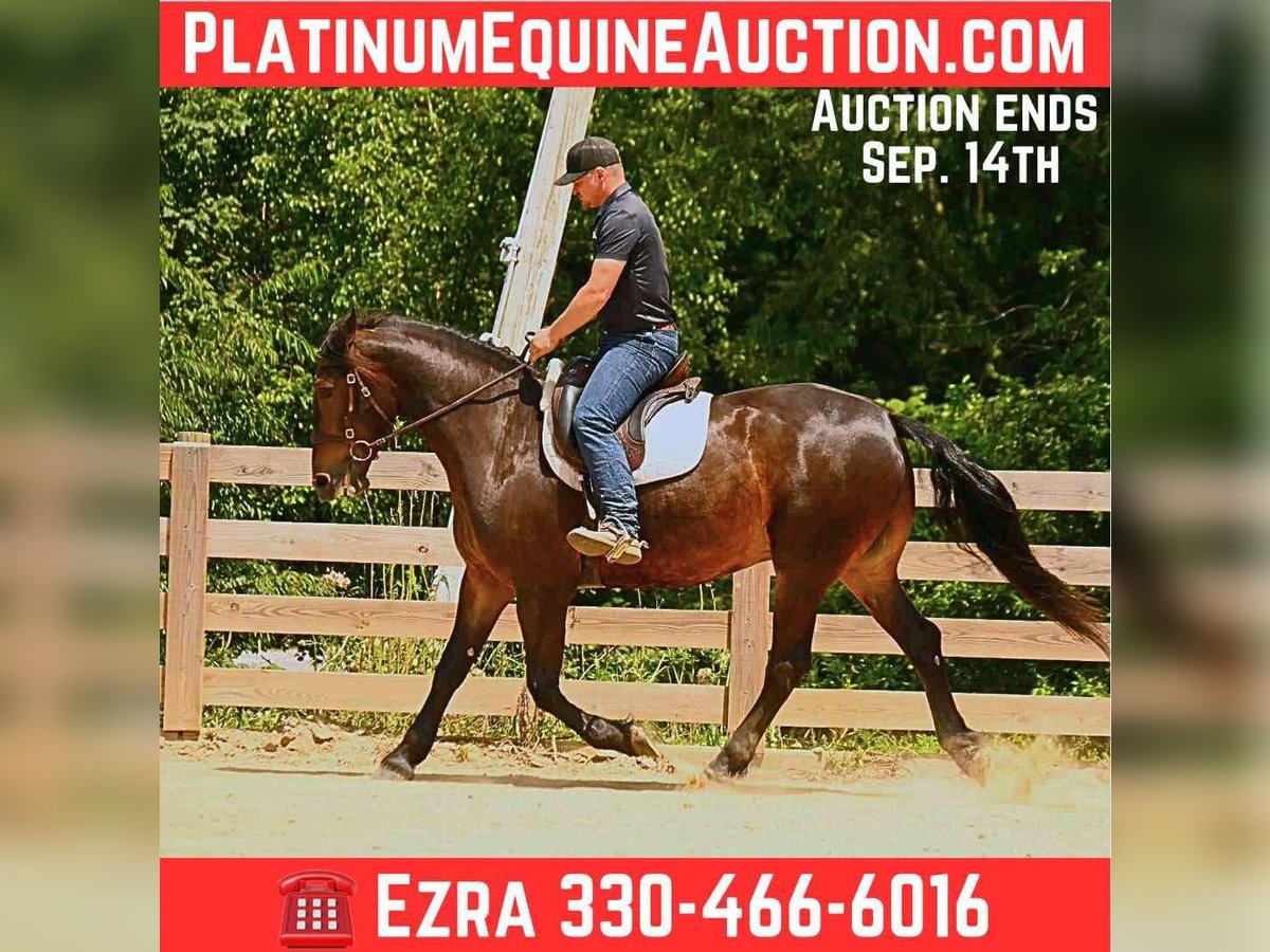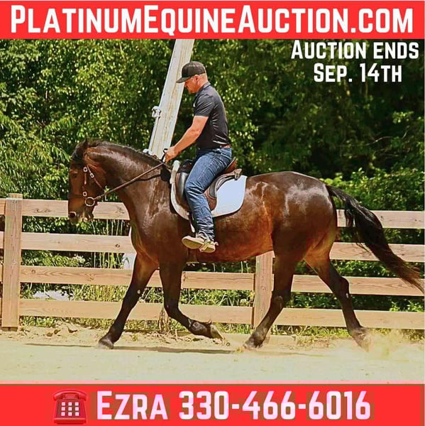 ONLINE AUCTION Place your bids at www.PlatinumEquineAuction.com Starting Bid $3500 Auction ends September 14th, 2025 Need a new saddle? Check out White Rock Saddles on our website or Facebook Maverick is a gorgeous 5-year-old, 15.3h, Bay, Friesian gelding is as safe and reliable as they come. He is broke for anyone to ride—perfect for beginners or those looking for a trustworthy partner. ✅ Traffic safe and sound ✅ Will cross water, creeks, and tarps without hesitation ✅ Up to date on vaccinations and coggins ✅ Beginner safe, gentle, and easy to handle Whether you’re looking for a family horse, a confidence builder, or a flashy partner for trail riding, Maverick has the temperament and training to fit the bill. For more info contact Ezra with No Reins Performance Horses 330-466-6016. Located in Wooster, OH. ONLINE AUCTION Place your bids at www.PlatinumEquineAuction.com Starting Bid $3500 Auction ends September 14th, 2025 Need a new saddle? Check out White Rock Saddles on our website or Facebook