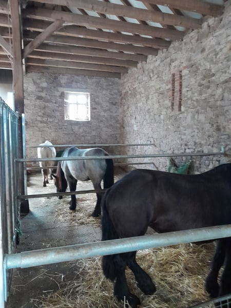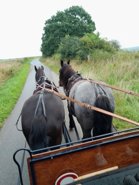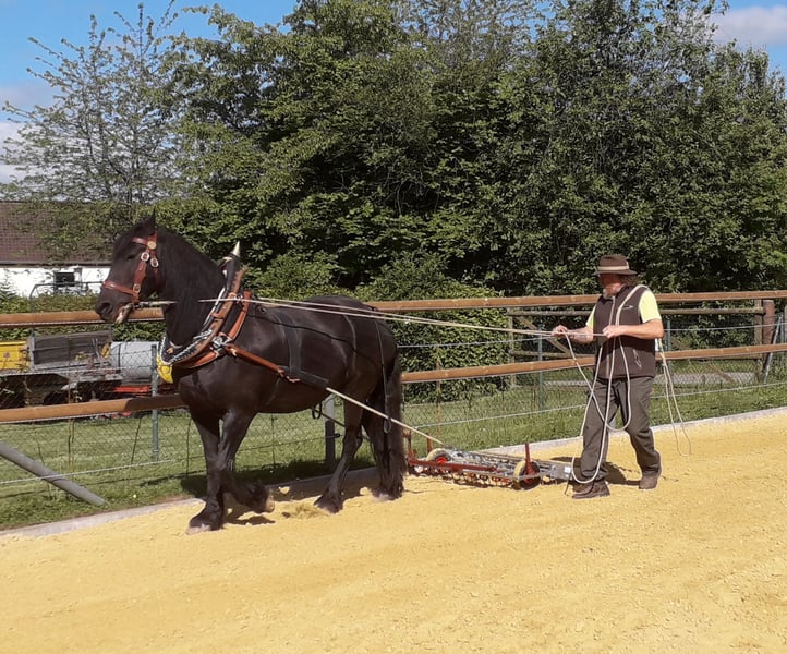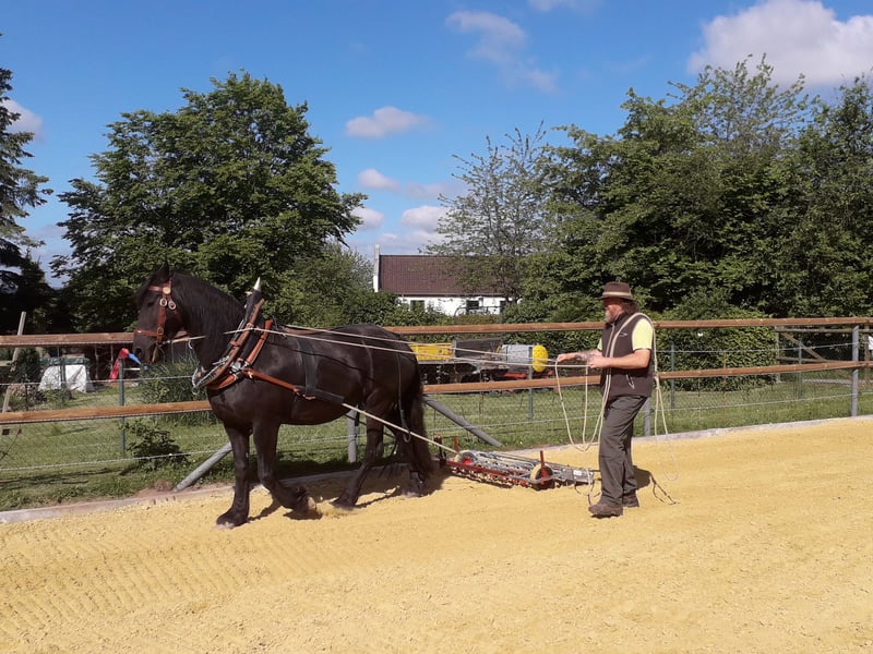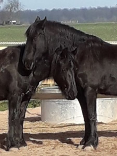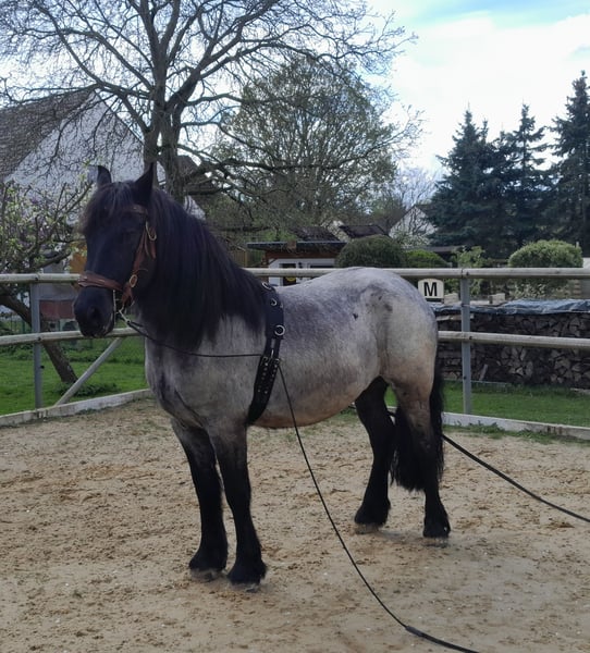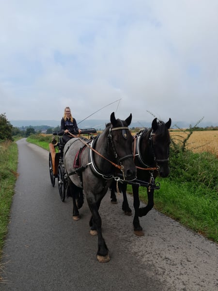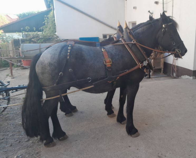 Zum Verkauf steht hier ein Friesen/Friesen-Pfalz-Ardenner-Mix - Kutschen-Pass-Gespann. Es handelt sich um Mutter und Sohn. Die Mutter ist eine reinrassige Friesenstute, Alter: 18 Jahre. Die Stute befindet sich seit ihrem 1. Lebensjahr in meinem Besitz und wurde fachmännisch ausgebildet. Sie ist geländesicher, sowohl beim Fahren, als auch beim Reiten, sehr lieb und menschenbezogen im Umgang und sowohl für Anfänger als auch für Kinder geeignet. Ihr Sohn, selbstgezogen und seit Geburt bei mir aufgewachsen, ist ein Friesen-Pfalz-Ardenner-Mix, Alter: 6 Jahre. Der Vater des Wallachs ist ein in der Pfalz-Ardenner-Zucht bekannter Hengst. Der Wallach ist ein sog. Farbwechsler, Farbe: Blue-roan. Beide Pferde haben einen Equidenpass, sind regelmäßig geimpft und entwurmt und gechipt. Auch werden beide regelmäßig einer zertifizierten Hufpflegerin vorgestellt. Beide sind barhufer & an Hufschuhe gewöhnt, auch zum Fahren. Ein klassischer Beschlag oder auch Klebebeschlag ist jedoch auch möglich und bekannt. Jedes Pferd ist gesund und in einem altersgemäßen Zustand. Beide Pferde sind eingeritten, kennen Platz, Halle und Gelände, sollten jedoch ihrem jeweiligen Alter entsprechend (weiter) gefördert bzw. beansprucht werden. Besichtigung, gemeinsames Probefahren und auch Reiten ist nach vorheriger Absprache möglich. Es ist eine passende Kutsche samt dem benötigen Zubehör vorhanden, welches gesamt mit Aufpreis miterworben werden können. Der Käufer kann auf seine Kosten eine AKU durchführen lassen. Es handelt sich um einen Privatverkauf, d. h. der Verkauf erfolgt unter Ausschluss jeglicher Sachmängelgewährleistungen und ohne Garantieen. Es wird bei Einigung ein Schutzvertrag mit dem Käufer geschlossen und Platz und Eignung der zukünftigen Halter zuvor geprüft. Ich suche für meine beiden Pferde aus persönlichen Gründen einen geeigneten Platz. Es handelt sich jedoch nicht um einen Notverkauf!! Für Rückfragen stehe ich jederzeit unter der angeg. Handy-Nr. zur Verfügung.