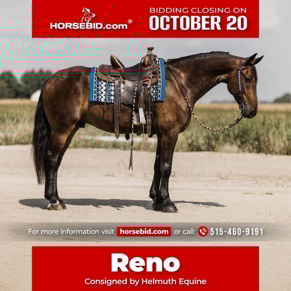 ♦️ 𝐭𝐡𝐞 𝐀𝐌𝐄𝐑𝐈𝐂𝐀𝐍 𝓕𝓪𝓵𝓵 𝓒𝓵𝓪𝓼𝓼𝓲𝓬 ♦️ Happening now thru MONDAY | OCTOBER 20th - Available EXCLUSIVELY on HorseBid's website! For more details and to register visit: www.Horsebid.com CONSIGNOR CONTACT: Helmuth Equine 515-460-9191 LOCATION: Ames, IA BREED: Friesian Sport Horse REGISTERED: Yes REGISTERED NAME: Reno COLOR: Bay HEIGHT: 16 AGE: 5 GENDER: Gelding Meet Reno, a 5 year old, 16 hh Registered Friesian Sport Horse gelding. Reno is very well broke to both ride and drive. We’ve had him around all summer and have mostly used him as a trail horse. He is exceptionally safe and confident on any type of trail. He could use a bit more time working on his canter in the arena. He will never buck, bolt, take off, or do anything naughty whatsoever. He simply hasn’t had much experience cantering yet, so he’s a bit green in that area. For that reason, I’d say he’s best suited for someone with at least some experience. We’ve driven him into town and all over the farm, both single and in a pair. Reno could easily go in almost any direction with more time and training. He’s very smart, has absolutely no vices, loves to work, and is happy in nearly any situation you put him in. Reno is a very nice mover and could easily be developed into a really nice dressage horse. He’s 100% traffic safe, not spooky about anything, and has a smooth, easy to sit trot. He has fantastic ground manners, is easy to catch, and requires no special maintenance. The only blemish he has is a slightly thickened right rear cannon bone, it’s always been that way. During his vet exam, he flexed 100%, and it has never bothered him in any way, shape, or form. If you’re looking for a great minded horse with the potential to go in any direction, Reno is your man.