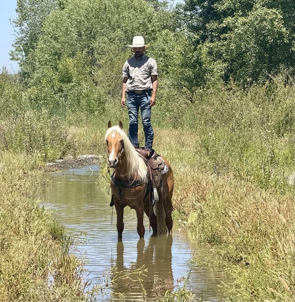 ONLINE-AUKTION Geben Sie Ihre Gebote ab unter www.PlatinumEquineAuction.com Startgebot 3500 $ Die Auktion endet am 8. Juni 2025 Brauchen Sie einen neuen Sattel? Schauen Sie sich White Rock Saddles auf unserer Website oder Facebook an! Lernen Sie 24-Carrot kennen. Dieser goldene Palomino ist ein echter Blickfang und zieht mit seiner strahlenden Schönheit alle Blicke auf sich. Stellen Sie sich vor: ein prächtiges Pferd mit einer langen, fließenden Mähne und einem Schweif, die im Sonnenlicht schimmern. Mit einer Höhe von 16 Händen ist er ein lebendes, atmendes Kunstwerk. Und obwohl er erst 5 Jahre alt ist, trägt er sich mit der Ruhe und dem sanften Wesen, das man von einem viel älteren Pferd erwarten würde. Er hat diese niedliche Welpenpersönlichkeit, die einfach Ihr Herz erweicht. Ich schwöre, wenn er könnte, würde er direkt neben Ihnen auf der Couch kuscheln! Das Reiten von 24-Carrot ist ein absoluter Traum. Er wechselt so sanft und graziös zwischen Schritt, Trab und Galopp. Er hat einen schönen Kopfansatz, reagiert wunderbar auf Beinküsse und stoppt und weicht mühelos zurück. Man merkt, dass er für verschiedene Disziplinen ausgebildet wurde. Aber lassen Sie sich von seinem guten Aussehen nicht täuschen – er ist auch unglaublich vielseitig! Ob er schwierige Trails meistert oder Hindernisparcours bewältigt, er geht alles mit dem Selbstbewusstsein eines erfahrenen Profis an. Was mich an 24-Carrot wirklich fasziniert, sind seine freundlichen, intelligenten Augen. Sie sagen viel über seine Persönlichkeit aus. Er bleibt selbst an belebten Straßen ruhig, was ihn super sicher für Reiter aller Erfahrungsstufen macht. Er hat Erfahrung auf Trails, meistert Wasser, Baumstämme, Bäume und Wildtiere mit Zuversicht. Er hat nichts dagegen, allein oder mit anderen Pferden zu reiten. Er wurde verwendet, um Rinder zu sammeln, und bleibt in jeder Situation gelassen. Außerdem ist er ein Champion auf Hindernisparcours und lässt sich von Brücken, Fahnen, hüpfenden Bällen und Planen nicht aus der Ruhe bringen. Dieser großartige Junge freut sich immer, Sie zu sehen, steht geduldig für alles, von Satteln bis zur Badezeit, und reist gut. Wenn Sie Interesse haben, 24-Carrot zu treffen, wenden Sie sich an Dina von Longhorn Ranch unter 831-537-1915. Er befindet sich in Paicines, CA, und kann den Versand in den gesamten USA arrangieren. ONLINE-AUKTION Geben Sie Ihre Gebote ab unter www.PlatinumEquineAuction.com Startgebot 3500 $ Die Auktion endet am 8. Juni 2025 Brauchen Sie einen neuen Sattel? Schauen Sie sich White Rock Saddles auf unserer Website oder Facebook an!