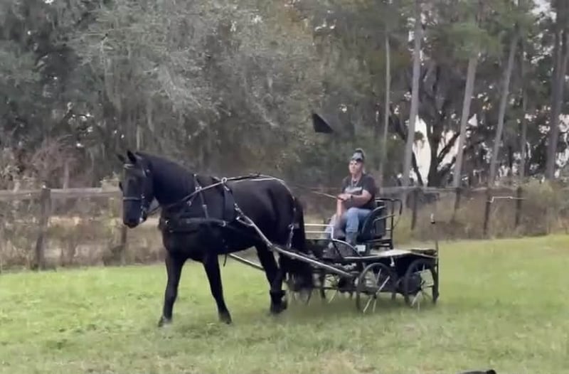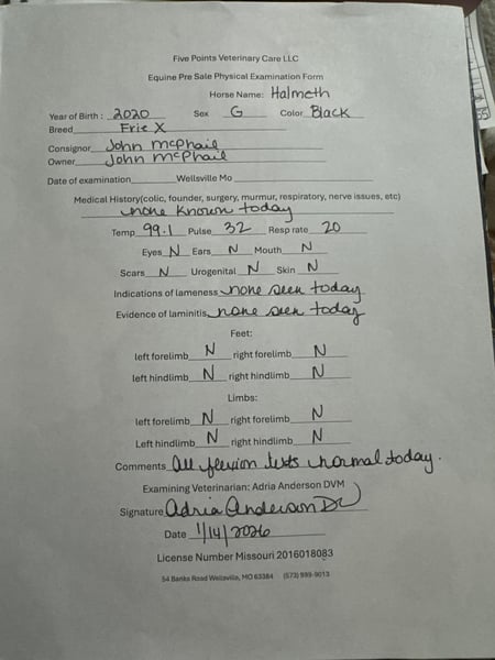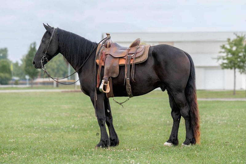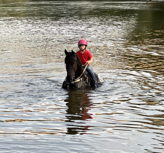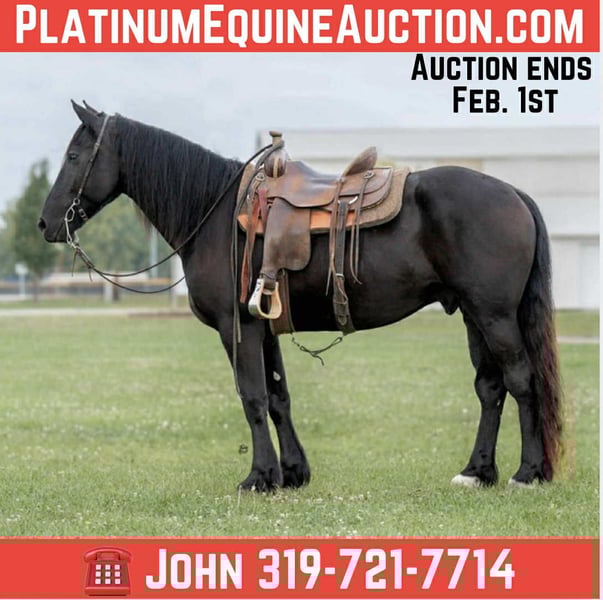 Helmuth 6-Year-Old Black Friesian Sporthorse Gelding | 16.1 Hands Helmuth is a striking six-year-old black Friesian Sporthorse gelding standing 16.1 hands tall, offering a rare combination of elegance, versatility, and true usability. He is exceptionally well broke to ride both Western and English, is one-hand neck rein broke, and will even slide to a stop like a seasoned Quarter Horse. Helmuth is trained in dressage movements, is very soft in the face, and is responsive yet forgiving—making him a pleasure to ride for a wide range of horsemen. Beyond the saddle, Helmuth is an outstanding driving horse, working confidently single and double. He has been driven in downtown parades, around heavy traffic, and even with fireworks, trains, and Harley-Davidson motorcycles without hesitation. Traffic, noise, and commotion do not bother him in the least. Helmuth’s ground manners are impeccable. He is easy to catch in both large pastures and small lots, stands quietly for the farrier, loads, clips, and hauls like a true gentleman. He will lower his head to be bridled or haltered—even by a child—and stands like a statue for mounting and dismounting from a block, trailer fender, picnic table, or other obstacles. He is respectful in a herd setting with other horses and ponies. This gelding has seen real work. He has been ridden in the mountains and canyons, crossed railroad tracks with trains passing, gone barefoot or shod on all terrain, and has been used to move hundreds of head of crossbred cattle from pasture to pasture. He also loves the water—happily riding through rivers and swimming with children. Helmuth is 100% sound, up to date on all vaccinations and worming, and is truly a one-of-a-kind all-around horse—equally suited for a ranch family, an experienced rider seeking a versatile mount, or someone wanting a top-quality buggy and driving horse. 📞 319-721-7714 Plenty of videos available upon request.