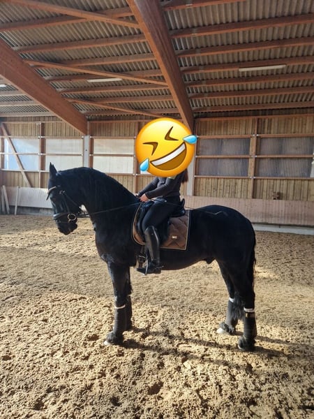 Mit schwerem Herzen muss ich mich wegen gesundheitlicher Gründe von meinem 10-jährigen Friesian-Gelding trennen. Er ist im Dressurtraining bis zur L-Dressur ausgebildet und springt auf gutem E-Niveau. Er ist im Gelände sicher und ein zuverlässiger Anhänger, regelmäßig geimpft und entwurmt. Er kann Zirkuslektionen, Auf- und Absteigen. Außerdem kennt er die Doppel-Longe und besitzt vollständige KFPS-Papiere. Die Zähne wurden im Februar gemacht. Größe 1,62 m. Zubehör kann gegen Aufpreis erworben werden.