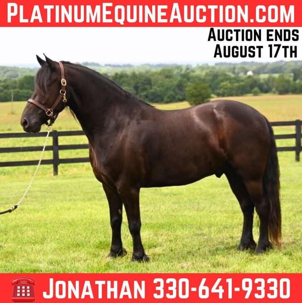 ONLINE AUCTION Place your bids at www.PlatinumEquineAuction.com Starting Bid $3500 Auction ends August 17th, 2025 Need a new saddle? Check out White Rock Saddles on our website or Facebook Dynamite is a Stunning 5-Year-Old Black Friesian Cross Gelding standing 15 Hands! If you’re looking for a horse with presence, brains, and a heart of gold, this 5-year-old Friesian cross gelding checks all the boxes. Jet-black with a thick mane and tail, he stands a solid 15 hands and turns heads everywhere he goes. Home-raised right here on our farm, he’s been handled with care and consistency since day one. He’s gentle, willing, and broke to ride for just about anyone—whether you’re an experienced rider or just getting started. Smooth in the bridle, quiet on the ground, and confident out on the trails. He’s been exposed to farm life, traffic, dogs, kids—you name it. Nothing seems to bother him. He’s got the graceful movement of a Friesian, the laid-back nature of a ranch horse, and the kind eyes to match. Whether you’re looking for a dependable trail partner, a classy pleasure mount, or just a solid, all-around good gelding, he’s the real deal. For more info contact Jonathan Schlabach 330-641-9330 with any questions. Located in Fredericksburg, OH. ONLINE AUCTION Place your bids at www.PlatinumEquineAuction.com Starting Bid $3500 Auction ends August 17th, 2025 Need a new saddle? Check out White Rock Saddles on our website or Facebook