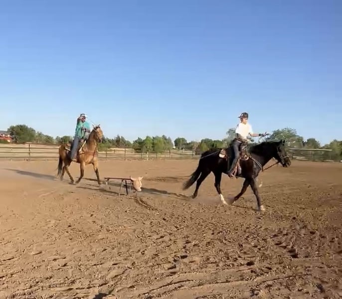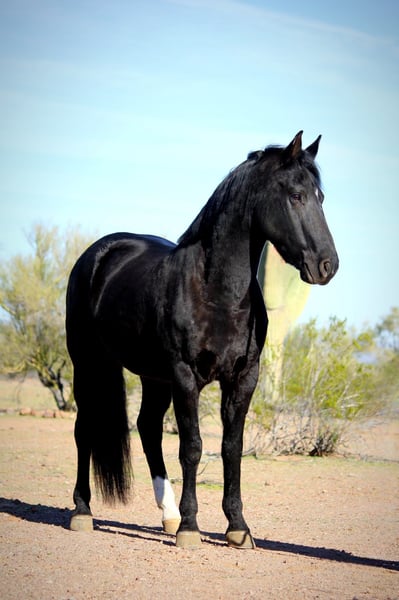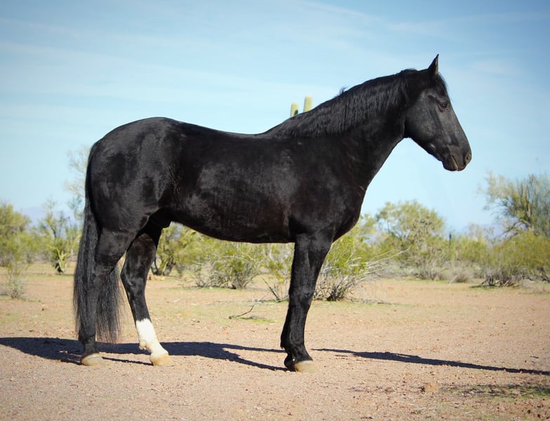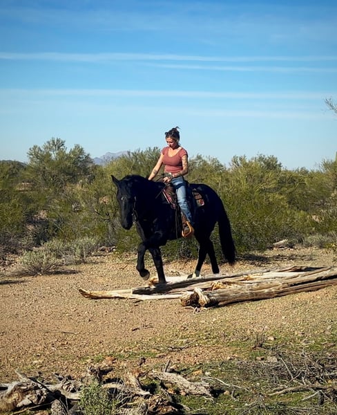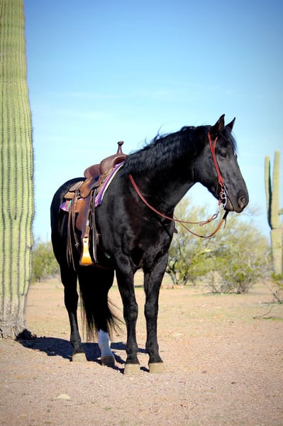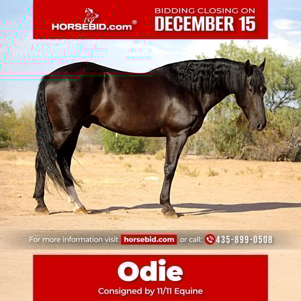 🎄𝐓𝐇𝐄 𝑯𝒐𝒍𝒊𝒅𝒂𝒚 𝐂𝐋𝐀𝐒𝐒𝐈𝐂🎄 Happening now thru MONDAY | DECEMBER 15th - Available EXCLUSIVELY on HorseBid's website! For more details and to register visit: www.Horsebid.com CONSIGNOR CONTACT: 11/11 Equine 435-899-0508 LOCATION: Marana, AZ BREED: Friesian Cross REGISTERED: No COLOR: Black HEIGHT: 15.1 AGE: 6 GENDER: Gelding Beauty, brains and versatility… Odie has it all! This sweet gelding is a 6 year old friesian QH cross gelding standing a stout 15.1 hands tall. He has a stunning jet black coat and turns heads everywhere he goes. Odie is the type of horse that wants to be your best friend, he has an in your pocket personality and loves getting attention and being loved on. He’ll be the first one to greet you at the gate! Odie has done a little of everything. He rides both English and western, has roped and dragged the dummy, pushed cattle, given riding lessons, trail rides and even started over small jumps. He also rides bareback and is very comfortable with his smooth gaits. Out on the trails Odie is confident and happy to go wherever he is pointed. He will cross brush and logs, go up and down the washes and is also comfortable on the streets as well. He has been ridden out alone as well as in groups. He is not a barn or buddy sour horse at all. Odie is gentle and safe, taking care of his rider in all environments. He has been exposed to tractors, dogs, traffic, and all the crazy things that come with small children such as bikes and mini four wheelers being driven through the barn aisle. On the ground Odie has great ground manners. He stands tied quietly, loves baths, good for the vet and farrier and loads and hauls nicely. He has no vices and is an easy keeper and requires no maintenance. Odie is ready to find his own adventure partner and best friend, he will give you 100% of his heart each and every day! Please feel free to call or text Claire at 435-899-0508 with any questions about this sweet boy! He is located in Marana, Arizona and we are also happy to help arrange transport anywhere needed!