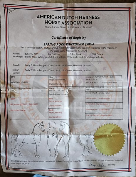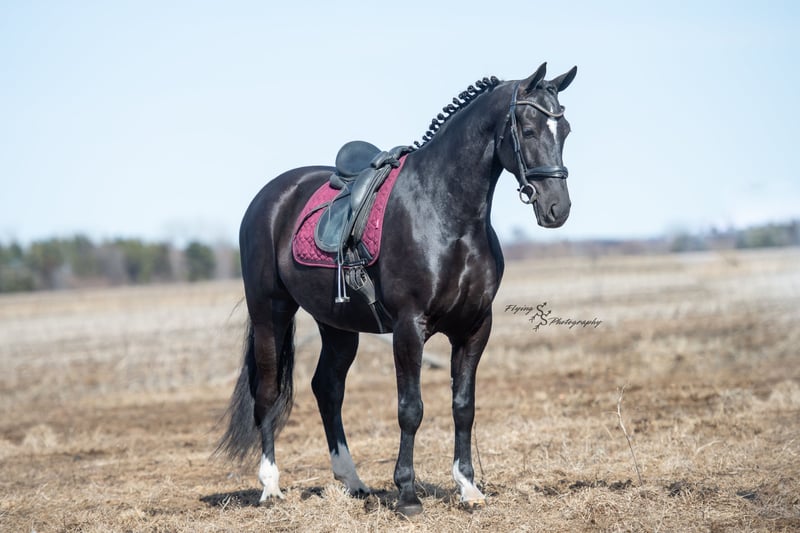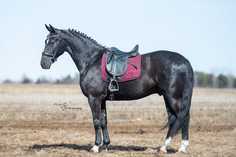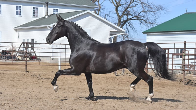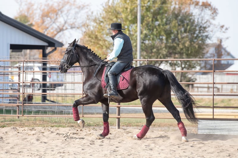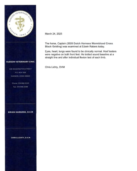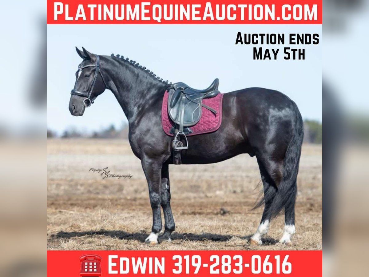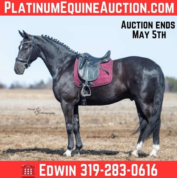 ONLINE AUCTION Place your bids at www.PlatinumEquineAuction.com Starting Bid $3500 Auction ends May 4th, 2025 Need a new saddle? Check out White Rock Saddles on our website or Facebook! Captain is a handsome, 6 year old, jet black registered American Dutch Harness gelding that stands 16h, and has incredible conformation. He is a very versatile gelding that rides English, western, and drives. Captain is an absolute natural at jumping and seems to really enjoy it, making him an amazing prospect as a hunter jumper. He is also coming along very well in dressage, and looks lovely under a western saddle for western dressage. Captain is most comfortable under saddle, and where we feel he will continue to excel in English riding. He is a gorgeous mover that easily catches your eye. Captain has been ridden inside and outside. He is comfortable out on the trails as well as in the arena. He will cross water, logs, and go through obstacles. He is quickly advancing in maneuvers under saddle. Even with time off, Captain can be tacked up and mounted without any funny business. He handles pressure well, and is such a fancy prospect for the show pen. Captain is a sensible gelding that has been a pleasure to train. He is very personable and easy to handle on the ground. Captain is also great for the farrier, and trims/shoes easily. If you are looking for a fancy gelding to show, or ride for pleasure, Captain is who you want in your barn! Captain is current on Coggins, and also has a PPE on file. If you have any questions, or would like to meet him prior to the auction ending, please call Edwin Raber 319-283-0616. Locateed in Fairbank, IA. ONLINE AUCTION Place your bids at www.PlatinumEquineAuction.com Starting Bid $3500 Auction ends May 4th, 2025 Need a new saddle? Check out White Rock Saddles on our website or Facebook!