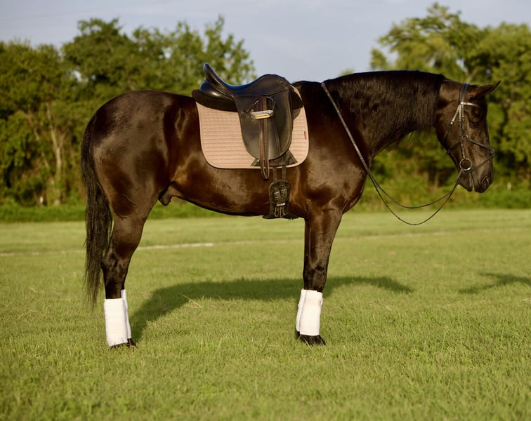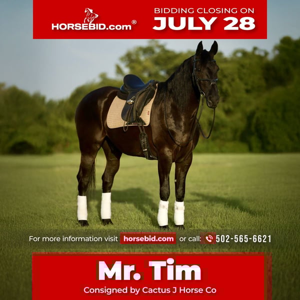 ⚔️ The HORSEMAN's Select ⚔️ Happening now thru MONDAY | JULY 28th - Available EXCLUSIVELY on HorseBid's website! For more details and to register visit: www.Horsebid.com CONSIGNOR CONTACT: Cactus J Horse Co 502-565-6621 LOCATION: Waco TX BREED: Fresian Sport Horse REGISTERED: Yes REGISTERED NAME: Mr. Tim COLOR: Black HEIGHT: 15.3 AGE: 7 GENDER: Gelding MR. TIM is an elegant 15.3 coal black Fresian Sport Horse gelding schooling beautifully in the the dressage ring with tons of potential to carry you through the levels! Rides quietly in the arena or hacking out alone & in a group. Safe and easy for any level rider with simple transitions, changes, and gaits. Lofty and comfortable at the walk, trot, and canter with a soft mouth and moves around easy off leg. A true gentleman in the stable to catch, groom, handle, saddle, mount, and ride. No silliness or vices of any kind.