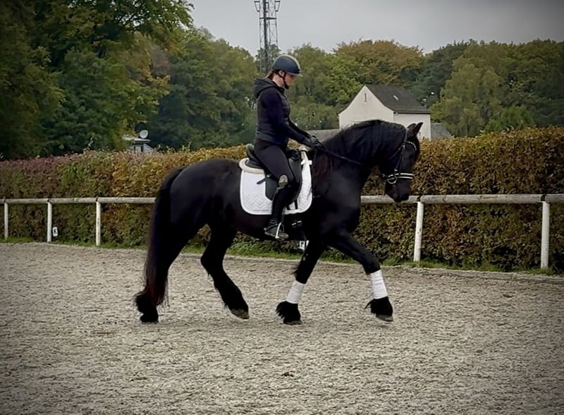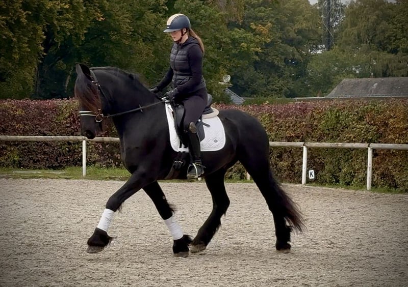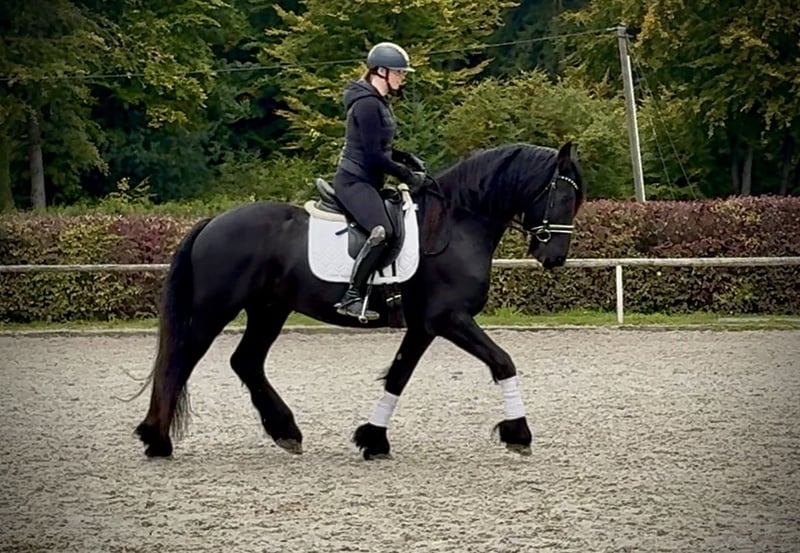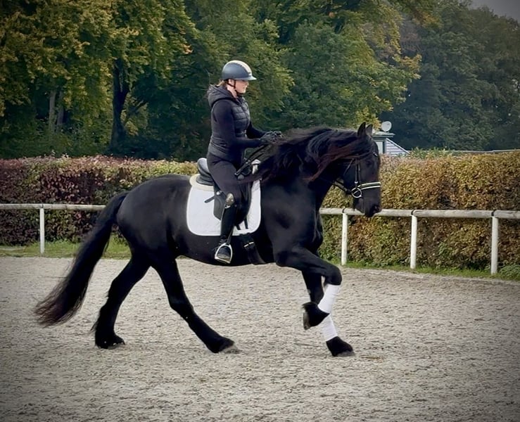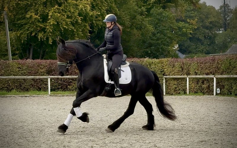 Name: Fryso Breed: Friesian Gender: Gelding Date of Birth: March 19, 2017 Age: 8 years Height: 1.63 m (16.1 hh) Color: Black (Rappe) Pedigree: documentation available Temperament: friendly and people-oriented, reliable, patient, curious, intelligent, brave, eager to learn Training/Suitability: ridden, dressage, leisure riding, Baroque riding style Trail Experience: dependable both alone and in a group Health: dewormed, vaccinated, barefoot, eczema-free, teeth checked, osteopathically treated Stabling: box stall, open stable Special Features: very good, expressive basic gaits; farrier- and loading-friendly; herd-compatible Please note: The characteristics described are based on our personal assessment and do not constitute guaranteed traits. Price: €14,500 (gross price) Interested? To give you a better impression of Fryso, we are happy to send you a video of him riding. Of course, we are available for a detailed description of the horse, personal consultation, and to answer all your questions by phone. Feel free to contact us anytime via WhatsApp or call us at: +49 151 19487595 Our phone hours are daily from 7:00 to 13:30 and after 20:00. We look forward to hearing from you! A clinical or radiological pre-purchase examination can be arranged with your veterinarian. Fryso can be safely and comfortably delivered to his new home. We handle all preparations and transportation to ensure your new horse arrives stress-free, well cared for, insured, and in good health. Currently, we offer a carefully selected range of horses for sale. With us, you are sure to find your dream horse. Visit us also on our homepage at: www.marvinsroyalhorses.de Dear customers, we are happy to introduce you to our horses and offer grooming, tacking, lunging, ground work, and trial riding in the riding hall, on the arena, or in the field to help you get to know your new family member better. The fee is €40 per horse, and €30 for each additional horse; these costs are refunded upon purchase. Our address: Ferdinand Grube 50 53577 Neustadt-Wied Google Maps: marvinsroyalhorses