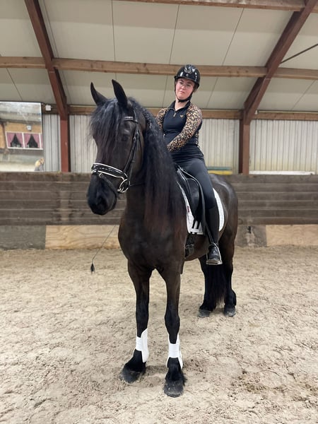 Haiko is een prachtige 8-jarige Friese ruin met een stokmaat van 1.68 m. Zijn afstamming is bijzonder interessant: hij is een zoon van Tsjalle 454, met Thorben 466 als moedersvader. Deze indrukwekkende verschijning combineert schoonheid met karakter. Haiko is eerlijk, ontzettend vriendelijk en valt direct op door zijn knappe uiterlijk. Daarnaast is hij talentvol, werkwillig en zeer leergierig, wat hem een ideaal paard maakt voor de ambitieuze ruiter. In de omgang is Haiko gemakkelijk en betrouwbaar. Ook op vreemd terrein blijft hij rustig en gefocust, wat hem extra geschikt maakt voor wedstrijden en buitenritten. Momenteel loopt Haiko op Z1-niveau dressuur en hij beschikt over duidelijke aanleg en potentie voor de hogere sport. Daarnaast is hij ook beleerd voor de wagen, zowel enkel als dubbelspan, en doet dit met zichtbaar plezier. Verder is Haiko braaf in alle dagelijkse handelingen, Loopt netjes en zonder problemen de trailer op Jaarlijks correct geënt Regelmatig gecontroleerd door tandarts en hoefsmid Gedraagt zich hierbij voorbeeldig Kortom: een compleet paard voor zowel dressuur als mennen, met uitstraling én kwaliteit. Interesse in deze bijzondere Fries? Neem gerust contact op voor meer informatie of om kennis te komen maken. Sanne 📞 0642507861 ( bel of Whatsapp)