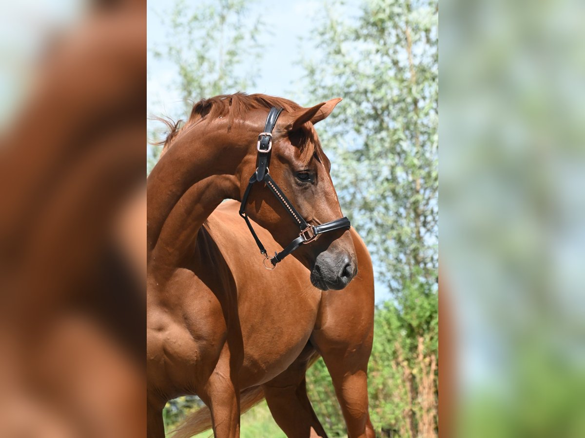 This very sweet 4 yrs old chestnut mare is homebred (4th generation). She has 3 good gaits and is very social (horse as well as people) and always in a good mood. She is just saddle broke. She has clean x rays and is located in the middle of Holland. Her father is the beautiful Vainqueur (Vivaldi) which is ridden by Dorothee Schneider at GP level. Mothers father is Sorento (GP, Sandro Hit) and grandmothers father is Rubiquil (GP, Rubinstein), so al lovely pedigree. Vainqueur is no longer available for breeding.... For more information sent me an app, no calling please.