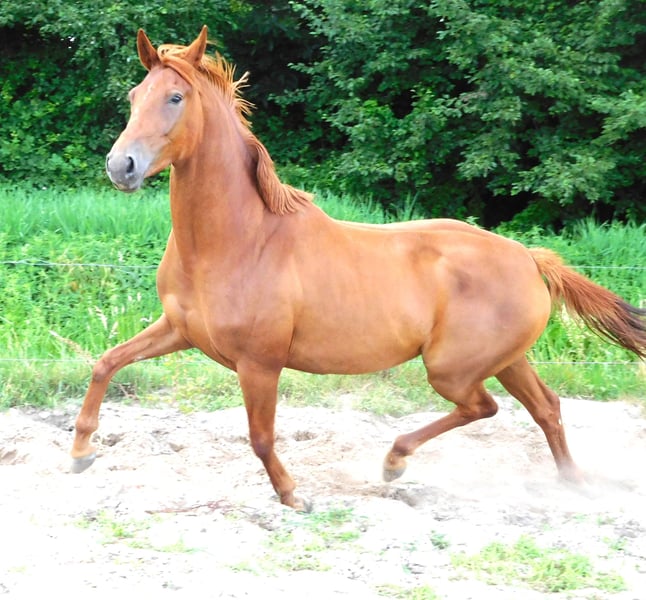 Isarah van Drakensteyn, alias Saar, is van april 2022 en is nu goed zadelmak. Een zeer lief mensgericht paard dat ook heel sociaal is met andere paarden en probleemloos in een (gemengde) kudde loopt. Ze heeft een heel fijn karakter. Ze heeft een slanke bouw en meet 1,65/1.66 m maar is nog erg jeugdig waardoor ze zeker nog wel wat doorgroeit… Amazone op de film is 1,78 m. Saar is zeer correct gebouwd met rechte benen en goede voeten. Zij is in juli 2025 röntgenologisch goedgekeurd zonder bemerkingen incl. hals en rug. Saar heeft heel goede rontgenfoto's! Ook is zij, voordat ze beleerd werd, bij de tandarts zijn geweest. Haar vader is de prachtige hengst Vainqueur (Vivaldi x Rubioso) die in Duitsland succesvol GP loopt onder Dorothee Schneider. Haar moeder is een ster prestatie merrie van de GP hengst Sorento (Sandro Hit x Donnerhall) die nu 19 jaar is. Saar was haar eerste veulen (4e generatie eigen fok) en vorig jaar heeft ze een merrieveulen van de hengst Red Viper gekregen. Deze merrie heeft ook nog altijd prachtige droge benen en heel gezond.... Daarachter zit de GP hengst Rubiquil (Rubinstein x Roemer), het paard waar Laurens van Lieren zijn carrière mee is begonnen. Saar zou bijzonder geschikt zijn voor een amazone die de overstap van de pony's naar de paarden wil maken, maar ze is niet geschikt voor een onervaren of onzekere ruiter. Ze is vlug en sensibel maar op een goede manier, nooit bokken of steigeren. Ze staat keurig stil bij opstappen. Ze zou echter ook geschikt zijn voor de fokkerij. Ze wordt verkocht onder voorbehoud van gunning en valt in de iets hogere prijsklasse. Wil je eens kennismaken met deze mooie oranje dame? Dat kan, stuur mij een appje (ivm werk niet bellen). Saar staat momenteel in het midden van het land, komt begin mei weer terug naar huis (net boven Amsterdam) Graag alleen appen ivm werk 06-11343740