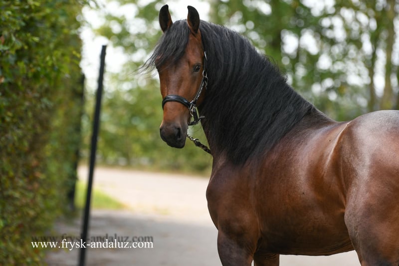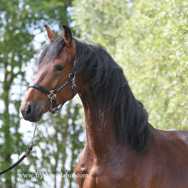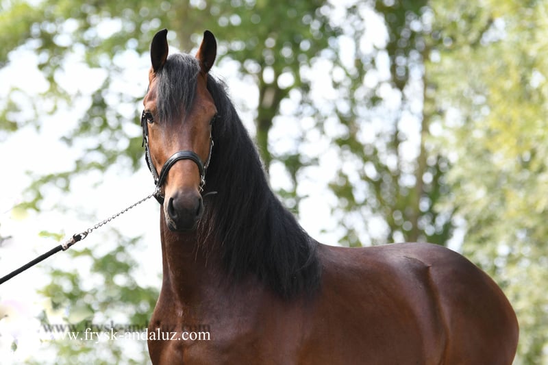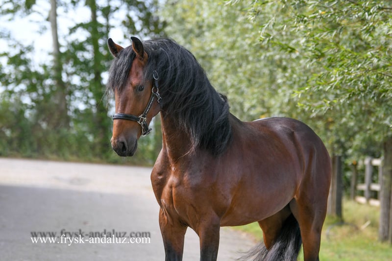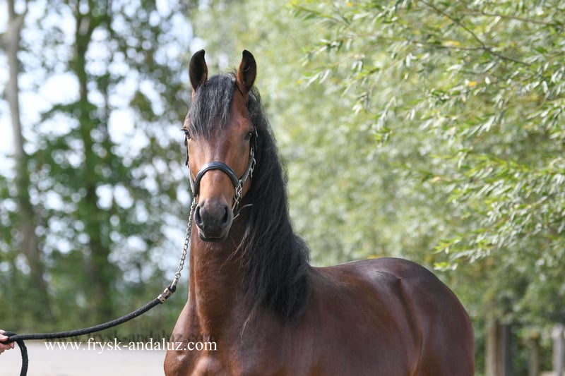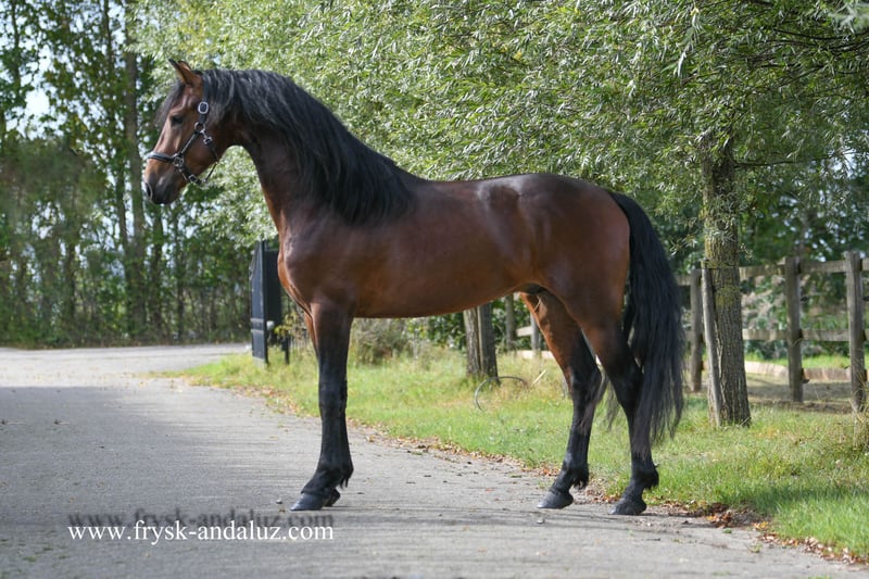 His name says it all, he is a masterpiece! Actually the best of both worlds. The mother of Master is a KWPN elite prok mare by Jazz x Montecristo and his father is our own show horse Messi of the Gonda Ster+Sport. Both parents of Masterpiece come from very good maternal lines and we really see that reflected in Masterpiece. Master is therefore bred by us, raised and trained with us, we know his entire history and can tell you that he has always been handsome, sweet, and healthy. Masterpiece is thus a horse with a golden edge, a special appearance with his brown color, but also long mane and some socks. He truly combines a Friesian with a KWPN. Master has been under saddle for a few weeks now and is doing this very well; he is already very pleasant to ride, has quite a bit of balance, and always tries his best. Master is not hot, but is forward-going and willing to work. He is actually the ideal horse to take to competitions. We would love to see Master with someone who wants to enjoy sports but also sees him as a companion, as he truly is for us! He is a special horse, a horse with a big, somewhat mischievous heart, with an amazing presence and super movements. Masterpiece is good on X-rays. For videos under saddle, in hand, and free: https://www.frysk-andaluz.com/nl/paard/masterpiece-fries-x-kwpn-kruising/