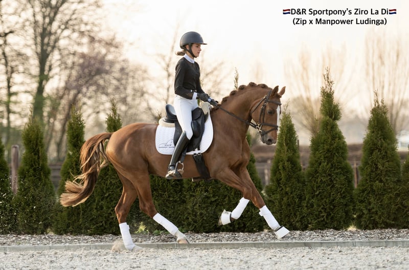 D&R Sportpony’s Ziro La Di Afstamming: Zip (v.Zodiak) x Manpower Ludinga Geboortejaar: 2017 Stokmaat: 1.48m Goedgekeurde hengst (Kan gecastreerd worden) D&R Sportponys Ziro-La-Di (Zip x Manpower Ludinga) is een zeer interessante allround ponyhengst. D&R Sportpony's Ziro-La-di viel tijdens de hengstenkeuring van 2020 op door zijn sterke beweging met aansprekend voorbeen gebruik, super spring techniek, lang gelijnde bouw en een echte hengsten uitstraling. Een super fijne hengst met en top karakter. Zijn vader, de recentelijk met het KEUR predikaat bekroonde ponyhengst Zip (Zodiak x E-Boy), is een internationale dressuurtopper terwijl de genen van Zodiak ook internationaal in de springsport zeer goed uit de voeten komen. Zip liep met Jill Bogers in de internationale dressuursport met mooie A-kader scores en loopt inmiddels met zijn vierde amazone Z-dressuur. De moeder van D&R sportpony's Ziro-La-Di is de palomino Keur merrie Mistique La-Di (V. Manpower Ludinga). Als 3-jarige werd zij nationaal kampioen op de NRPS keuring. Op de keuring viel de merrie op door haar lang gelijnde bow, aansprekend voorbeen gebruik en een sterk achterbeen. Dit heeft zij dan ook door gegegeven aan haar zoon Ziro-La-Di. De merrie heeft op 4-jarige leeftijd de Subli Cup bij het springen gewonnen en heeft zelf inmiddels nationaal Z gesprongen. Vader van Nationaal Veulenkampioen (🇳🇱D&R Sportpony’s Zidane🇳🇱 reeds goedgekeurd bij het AES Stamboek in 2024) en de Nr 3 (Nova La Vie) van 2021 🏆🥇🥉 Prestaties; 🏆🥇 Kringkampioen Springen Klasse B Nr 1 geplaatst op stijl bij de 5- jarige Dutch Pony Championship springen 1.00/1.10 - Springen L - Dressuur geplaatst Z- Dressuur klaar Voor meer info neem dan contact met ons op D&R Sportpony's