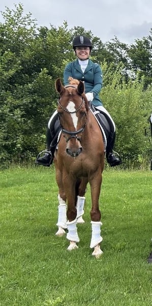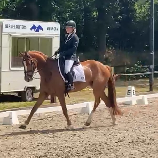 A talented 9-year-old gelding, measuring 162 cm at the withers. I personally backed Goldstrike myself four years ago. He is a willing horse and learns very quickly. Despite a pregnancy in between, we have progressed to Z1 level in dressage within four years, and he has already earned competition points. In training, we started with flying changes of canter, which he performs very well. He would also be suitable for a rider transitioning from pony to horse. Goldstrike is a healthy and alert horse, in good condition. He is very quiet under saddle and easy to ride. Four years ago, he was examined clinically and radiologically and was given a clean bill of health. Sired by Global Express out of Ultimo, by Oriënt Express.