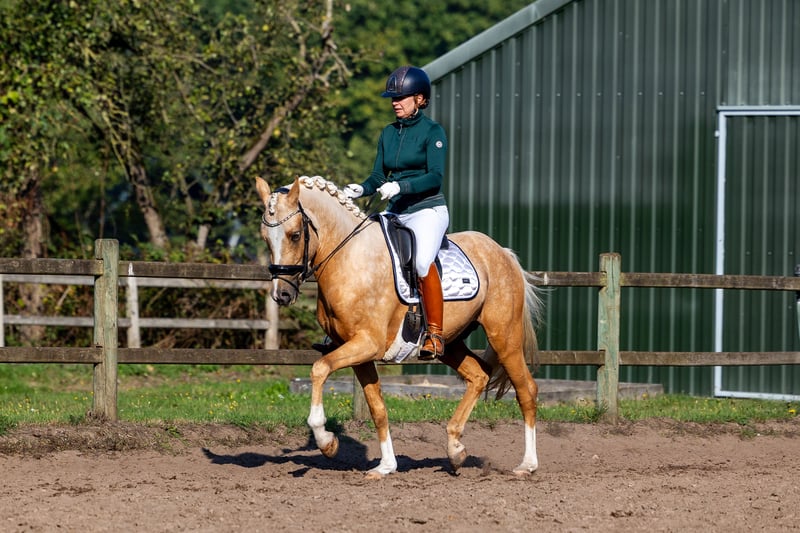 Bist du auf der Suche nach dem perfekten Sportpony, das immer 200 % Einsatz zeigt und super lieb ist? Dann lies schnell weiter! Harrisson's Gold ist ein kräftiger, wunderschöner, 3-jähriger Palomino-Hengst, der seinem Namen in jeder Hinsicht gerecht wird. Er misst derzeit 1,52 m. Dieser junge Hengst ist ein Nachkomme von His Royal Badness DK, dem international FEI dressur, Z2 klassifizierten Hengst, der auch an der EM teilgenommen hat. Darüber hinaus springt seine Schwester mütterlicherseits auf internationalem FEI-Niveau 1,20 m. Diese Linie zeichnet sich nicht nur durch feine Sportponys aus, sondern vor allem durch ihren lieben, sanften Charakter. Harry ist ein Traumpony. Als Fohlen erhielt er mit Bravour seine 1. Prämie. Während der Hengstprüfung erlangte er sein Deckerlaubnis, wobei er beeindruckende 9 Punkte für Trab, Galopp und Freispringen erzielte. Seine niedrigste Bewertung lag nicht unter 8! Seine wunderschönen Gänge, Tragkraft und Geschmeidigkeit kommen auch unter dem Sattel gut zur Geltung. Harry wird seit 3,5 Wochen von einer Inter 1-Reiterin weitergeritten, nachdem er in ruhigem Tempo an das Satteltraining gewöhnt wurde. Das ging ganz von selbst! Zitat der Reiterin: "Harry ist wirklich ein Traumpony! Ich habe die Besitzerin sogar gebeten, ihn nicht zu verkaufen! Ich kenne kein einziges 3-jähriges Pferd, das ich vor dem Reiten niemals longieren muss. Unabhängig vom Wetter in den letzten Wochen bin ich immer so aufgestiegen, wobei ich zuerst ein Stück unter dem Sattel über den Weg gegangen bin. Harry möchte so unglaublich gerne arbeiten und hat 3 super feine Gänge. Wenn ich das Geld dafür hätte, würde ich Harry wirklich selbst kaufen!" Auch im Umgang ist dieses Pony ein wahrer Gentleman. Harry zeigt überhaupt kein Hengstverhalten. Weder unter dem Sattel noch wenn er trainiert wird und mit mehreren Pferden/Ponys in der Reitbahn ist. Auch steht Harry mit einem anderen Hengst auf der Weide und im Paddock. Im Stall steht er das ganze Jahr über problemlos neben meiner Stute. Er genießt eine gründliche Pflege und geht zur Abwechslung auch regelmäßig mit unseren anderen Pferden auf Ausritte.