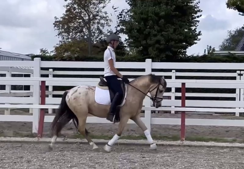Ce poney de 4 ans est prêt à relever de nouveaux défis. Avec un talent naturel pour le saut, il a le potentiel d'exceller dans le ring de concours. Il mesure 141 cm et a une couleur remarquable. Un mélange de buckskin et d'appaloosa, ce n'est pas quelque chose que l'on voit très souvent. Son père, Leuns Veld’s Winston jr., un palomino, a été vendu aux États-Unis en tant que poney de chasse. Aux Pays-Bas, il a été commencé en dressage Z1. Le père de la mère est le poney gallois étalon Bijsterhof’s Diamond Dancer. Woody a terminé deuxième dans la compétition de saut en liberté Youngirelander à Millstreet à l'âge de 3 ans. Ce beau hongre est non seulement un plaisir à monter, mais il a également un tempérament doux et une volonté d'apprendre.