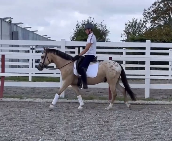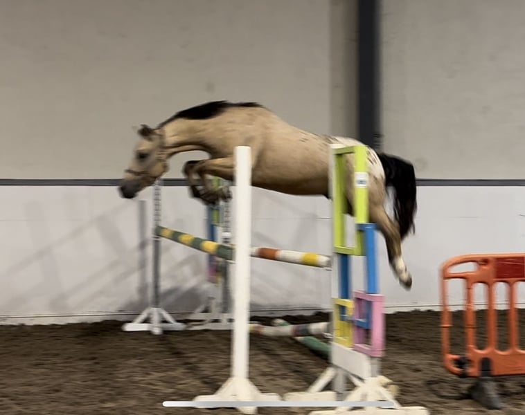 This 4-yr-old pony is is ready to take on new adventures. With a natural talent for jumping, he has the potential to excel in the show ring. He is 141cm and has a remarkable colour. Buckskin and appaloosa in one, you don’t see that very often. Sire Leuns Veld’s Winston jr., a palomino, was sold to the USA as a hunter pony. In the Netherlands he was started in the Z1 dressage. Damsire is the Welsh pony stallion Bijsterhof’s Diamond Dancer. Woody was second in the Youngirelander loosejumping competition in Millstreet as a 3yo. This handsome gelding is not only a joy to ride but also has a sweet temperament and a willingness to learn.