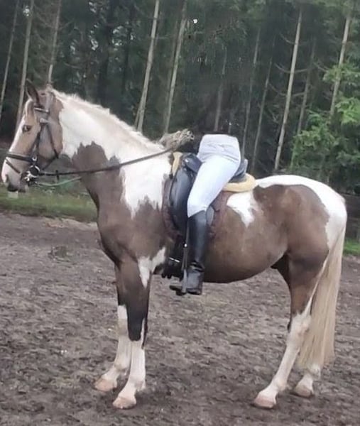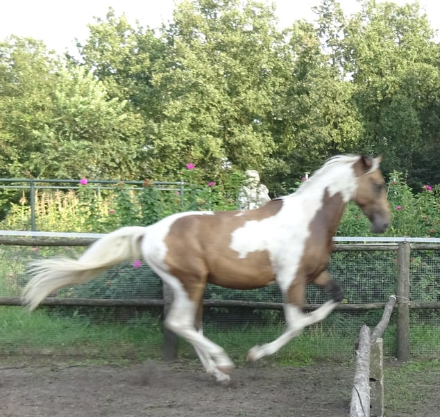 Unieke bonte valk ruin, talentvolle en bijzondere verschijning, 3 jaar oud. Een paard om mee te schitteren in de ring of een parcours. Bont valk is een kleur die zelden voorkomt! #Tobiano buckskin# Wil jij een echt uniek paard, niet alleen qua karakter, maar ook qua looks en beweging? Zoek dan niet verder! Hij is niet alleen mooi, opwaarts gebouwd met 3 zeer fijne en ruime gangen, ook qua karakter is dit een vriend voor het leven! Een liefdevol, betrouwbaar, eerlijk en zachtaardig maatje die voor je door het vuur gaat! GEGEVENS: -Geboren op 16-05-2022. -Meet momenteel 1.63m. Verwachtte stokmaat rond 1.65m. -Ingeschreven bij het NRPS. -Gechipt, gevaccineerd, ontwormd indien nodig en onder controle van tandarts. KARAKTER: -Makkelijk in de omgang, waarbij vertrouwen voor hem heel belangrijk is. -Gevoelig voor de hulpen waardoor zeer makkelijk trainbaar. Perfect voor dressuur. -Aanhankelijk, eerlijk, betrouwbaar, lief, enorme knuffel. -Heeft een duidelijke, consequente leider nodig die eerlijk, geduldig, liefdevol en zachtaardig is. Een harde hand begrijpt hij niet, wordt hij bang van en kruipt vervolgens in zijn schulp. -Hij geeft duidelijk zijn gens aan, bij vermoeidheid vraagt hij respectvol om te stoppen. UITERLIJKE KENMERKEN -Elegante maar sterke bouw. -Sterk gespierde achterhand en hals. -Veelkleurig: bonte valk (tobiano buckskin). Zijdezachte, stralende vacht. Een echte toverbal qua kleuren. Bij elk seizoen veranderd de valk kleur van tint. -Manen/staart: volle staart, voornamelijk wit, met een beetje zwart. Manen voornamelijk wit met in zijn voor pluk zwart en bruin. Wimpers wit en zwart. Let op; vachtkleur valk lijkt op de foto bruin maar is in het echt duidelijk te zien als valk kleur! -Uitstekende gezondheid en zeer sterke hoeven! -Ontzettend lenig, pré voor de dressuur. BEKEND MET: -Volledig verkeersmak. Bekend met alle landbouw voertuigen, vrachtverkeer en overige voertuigen en weggebruikers. -Bekend met meerdere soorten dieren. -Braaf bij de hoefsmid, dierenarts en tandarts. -Zadelmak en bekend met wandelen, longeren, grondwerk, Natural Horsemanship, parelli etc, en houdt van zwemmen! -Bekend met longe, pessoa, mentuig, barebackpad, zadel, dekens en overige materialen. -Momenteel wordt er alleen gestapt onder het zadel. -Uitermate geschikt voor de sport. Zowel dressuur als springen of mennen, alsook recreatief. -Erg leergierig en werkwillend paard. -Hele geschiedenis is bekend. In ons bezit vanaf de leeftijd van 6 maanden. Direct alles geleerd en van alles al mee gedaan. -Heeft altijd 24/7 buiten gestaan in paddock met in en uitloop stal, zomers weidegang. Van het tweetal paarden dat wij hebben, is hij bij ons de "kudde" leider. AFSTAMMING: #V: Poolse cremmelo hengst #VM: HURO'S FANTASTIC COLOR Hengst 2010 Bont 1,73 m KWPN 528003201012094 1,30m Spr. ZZ-Licht Bij interesse website stamboom ontvang ik graag een bericht #VMM: NANDO Hengst 1995 Zwart 1,64M KWPN 528003199500961 Tuigpaard LK+55 Bij interesse website stamboom ontvang ik graag een bericht Moeder ingeschreven bij het AES stamboom, waarvan haar vader en voorouders KWPN'ers zijn en allen top presteren als springpaard in de spring sport tot 1,70m hoogte. Haar moeder en ouders van haar moeder zijn allen KWPN'ers en presteren allemaal hoog in de sport bij mennen. Moeder wordt zowel bereden als gemend. #Er is tot nu toe alleen een aanvang gemaakt met stappen onder het zadel. Gezien de bak met de huidige weersomstandigheden amper bruikbaar is, zal dit niet verder opgepakt kunnen worden momenteel. Hij pakt alles verder zeer snel en zeer makkelijk op. Gezien zijn jonge leeftijd willen we niets overhaasten. Proef rijden is om deze redenen niet mogelijk. Hij is dus verder nog volledig naar eigen hand te zetten. Een beginnende ruiter is dan ook niet diegene die wij als toekomstig eigenaar zien.# Foto's van verschillende leeftijden. Van net geboren tot nu. Ruiter op de foto is 1,75m. Laatste foto's zijn van de ouders. Zijn vader is een Cremmelo hengst met blauwe ogen. Zijn moeder bont. Vraagprijs: €7.000,- Eventueel zwart lederen dressuurzadel ter overname voor €250,- en mogelijkheid tot overname van verdere benodigdheden. Filmpjes van onder het zadel op aanvraag. Zie mijn andere advertentie voor verkoop ander paard. Paarden mogen weg in verband met beëindigen hobby wegens gebrek aan tijd. Ze staan ons zeker niet in de weg! Bent u enthousiast geworden en zou u dit prachtig dier graag ontmoeten, dan hoor ik graag van u! Op zaterdagen niet bereikbaar.