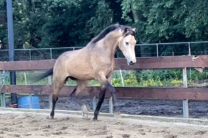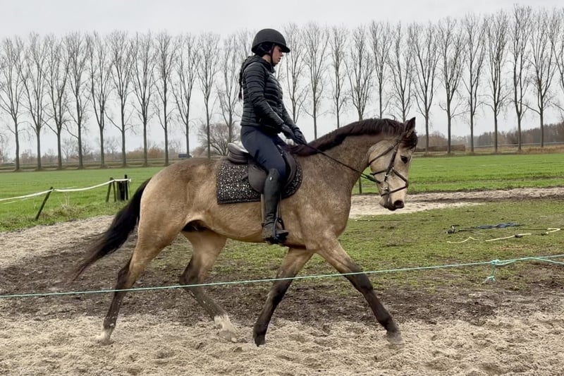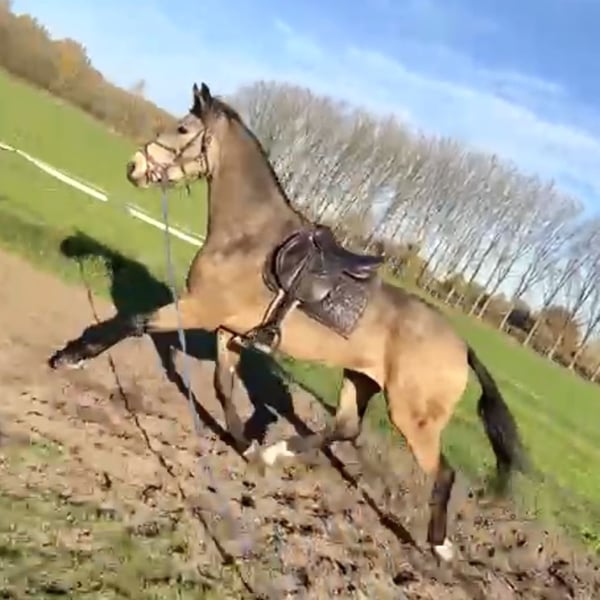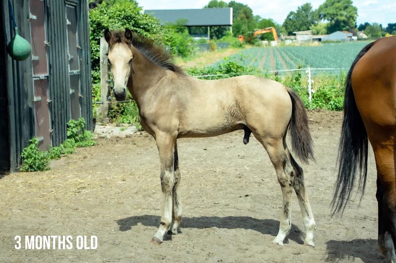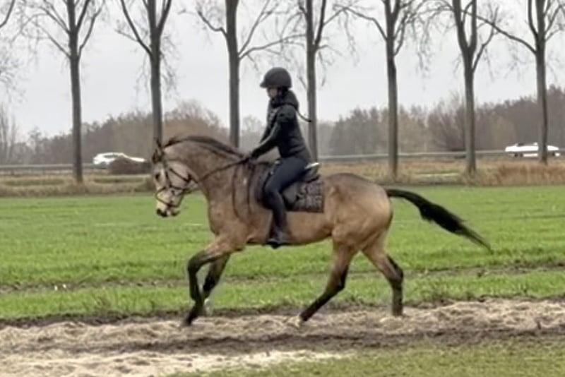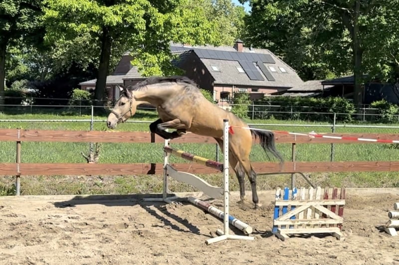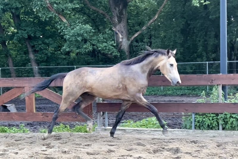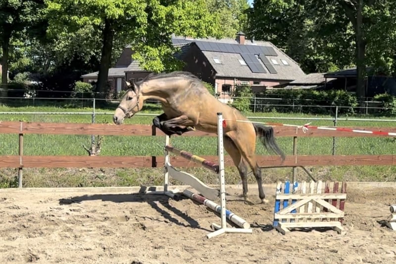 Westland van de Teugenaar is a 4 years old allround NRPS gelding. He measures now 1.67m and is expected to grow around the 1.69/1.70m. With his beautiful buckskin color, he's a real eye-catcher! CLEAN X-RAYS! Westland has a very interesting pedigree that combines dressage and jumping: Whatever van de Teugenaar (Whiteyassar x Montreal VDL x Emilion x Alme) x Discovery x Jonggor’s Weyden. We've owned his dam for 14 years now and she competed at Z1 dressage level with us and also jumped at 1.20m level before (she has been used as a breeding mare / broodmare in the last years). She also has the "Performance Sport" and "Keur" predicates and is WFFS-free. She is a Discovery x Jonggor’s Weyden. Behind Discovery are the stallions Dolany, Donnerhall, Donnerwetter Lorentin I, and Loutano, all of whom have competed at Grand Prix level. Donnerhall has over 160 approved sons and also got a lot of victories! Donnerhall achieved an individual third place (bronze) and team gold at the World Equestrian Games in Den Haag. At the World Championships in Rome, the German dressage team won a gold medal. Jonggor’s Weyden is the dam's sire and competes at Grand Prix level. He is the only approved dressage stallion in the world to ever win an individual medal at the Olympic Games. At the Atlanta Olympics, Jonggor’s Weyden, ridden by Sven Rothenberger, produced team silver and an individual bronze medal. In Westland's damline, you'll find, in addition to many other awards, the stallion Aktion, who also competed at Grand Prix level. Further back in the damline, we also find the stallion Pion, who was a Z2 dressage stallion and a 1.40m show jumper. There's also Akteur, who was a 1.60m show jumper. Westland's sire is the buckskin stallion Whatever van de Teugenaar (we also bred him ourselves). After successfully competing in his first competitions in the Netherlands, including two appearances at the Regional Championships with an amateur rider, he was sold to a French show jumper who also competed him in Belgium. He is now based in Italy, competing at 1.30m and being further prepared for higher-level. He is approved by the EU-recognized RBP Studbook and is out of the approved Cremello show jumping stallion Whiteyassar (who has passed away). He also comes from a very good damline, combining both sport and predicates. This line includes the renowned show jumping stallions Montreal VDL, Nimmerdor, Emilion, Wellington, and Alme, all of whom jump at 1.60m level. The renowned stallion Indoctro, who jumped at 1.40m level, is also in this line. His dam competed at 1.20m level under several riders in Belgium, the Netherlands, and France. Westland has a promising and allround pedigree. He is suitable for dressage, show jumping, and eventing. We just started to make him saddle broken. He knows the bridle, saddle and the lunge. He’s under the saddle for 2 weeks now. He has no (stable) vices! He has also CLEAN X-RAYS (without any remarks)! Pedigree: https://www.horsetelex.nl/horses/pedigree/2314022/westland-van-de-teugenaar The second-to-last photos are of the dam (Discovery x Jonggor's Weyden), and the last photos are of the sire, Whatever van de Teugenaar (Whiteyassar x Montreal VDL x Emilion x Alme). Asking price € 18.000