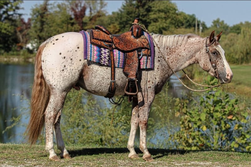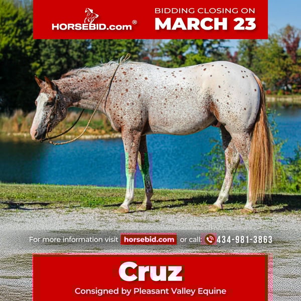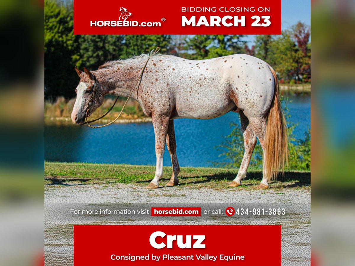 ⚜️𝓽𝓱𝓮 𝐆𝐎𝐋𝐃 𝓢𝓮𝓵𝓮𝓬𝓽⚜️ Happening now thru MONDAY | MARCH 23rd - Available EXCLUSIVELY on HorseBid's website! For more details and to register visit: www.Horsebid.com CONSIGNOR CONTACT: Pleasant Valley Equine 434-981-3863 LOCATION: Robards, KY BREED: POA REGISTERED: Yes REGISTERED NAME: Frost On My Zipper COLOR: Chestnut leopard HEIGHT: 14.2 AGE: 4 GENDER: Gelding Take a look at this stunning Appaloosa pony. Frost On My Zipper aka Cruz. With a huge show career in the POA racking up tons of points by a 13 year old youth. Cruz has been competitively shown in Halter & In-hand Trail since he was a weanling. Cruz has points in Showmanship, Trail, Western Pleasure, Hunt seat. He would be a great 4H horse or small adult looking for a show horse. Cruz stands 14.2h tall & as fancy as they come. Cruz is broke better then most. He can lope off from a standstill and get his leads everytime. He also leg yields, side passes, yeilds his hind quarters, and can work a gate. Cruz been mainly used for pleasure events but has all the buttons to go show in the Ranch Riding, and Western riding events. He also is very classy in his english attire & excells in the show pen. If your looking for a horse to show in the trail. Cruz does that too. He one you can show off to all your friends. Cruz also enjoys trail riding and walks quietly down the trail on a loose rein and will cross creeks, ditches, logs, and water without hesitation. He's always the first to meet you in the feild. If your looking to excelling in Western Pleasure, Showmanship, Hunter-Seat, Halter, Equitation, Jumping, Trail. Cruz is your guy. Don't miss out on this fancy pony that's sure to winn you blue ribbons. Cruz UTD on shots and coggins. He stands great for the farrier, baths, & clips Sells 100% sound & currently barefoot. Call today to make an appointment to meet Cruz.
