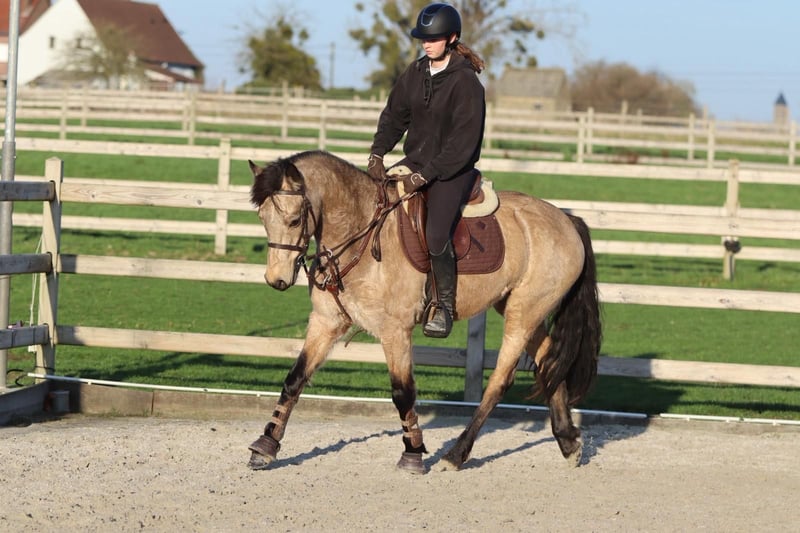 Connemara – 5-letnia klacz – 150–152 cm Goldie to wyjątkowo spokojna i uległa 5-letnia klacz rasy Connemara o pięknym, zwartej budowie. W codziennej obsłudze jest bardzo przyjemna: towarzyska wobec innych koni i całkowicie wolna od typowych cech charakteru klaczy. Dodatkowo, bardzo łatwo się ją transportuje. Pod siodłem Goldie wykazuje dużą moc i chęć do pracy. Zawsze jest spokojna i dobrze reaguje na polecenia, ale ze względu na jej energiczny charakter, jest szczególnie odpowiednia dla doświadczonych jeźdźców, którzy cenią sobie wyzwania i dynamikę podczas jazdy. Podczas skoków Goldie prezentuje dużą moc i entuzjazm. Bez problemu pokonuje przeszkody do 120 cm, zawsze z dużym zaangażowaniem. Nigdy nie odmawia skoku. Goldie została w pełni przebadana klinicznie i radiologicznie (kończyny, grzbiet i szyja) 24.06.2025, bez żadnych zastrzeżeń. 📞 Więcej informacji: 0032 475 68 22 43 🎥 Filmy: dostępne na naszej stronie internetowej (na życzenie)