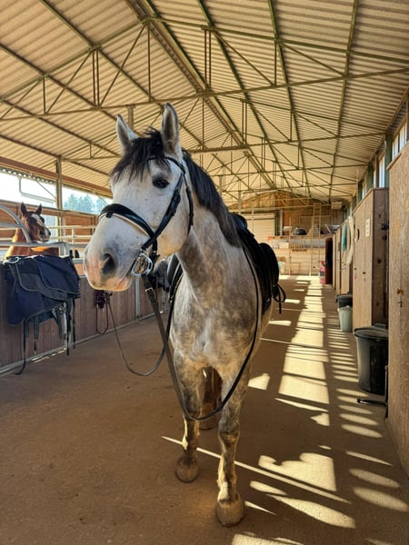 Zum Verkauf steht Dino, ein 5 jähriger Pony Wallach mit einer Größe von 1,53 m.☀️ Er hat ein gesundes und robustes Fundament, lässt sich in der Halle so wie im Gelände brav in allen GGA reiten und zeigt sich dabei unerschrocken. In der Bodenarbeit zeigte er als er zu uns kam zunächst Abwehrverhalten auf Druck, ist aber mittlerweile sehr fein an den Hilfen und reagiert super auf Stimmkomandos und hat sogar Spaß an den Freiarbeit entwickelt! Er läuft Barhuf und im Gelände vorne mit Hufschuhen. Verladen und Anhänger fahren sind für ihn kein Problem. Wir wünschen ihm ein Zuhause, in welches Jungpferdeerfahrung hat und individuell auf ihn eingehen kann. Offenstallhaltung erwünscht, er kennt aber auch die Box mit täglichem Weidegang in der Herde