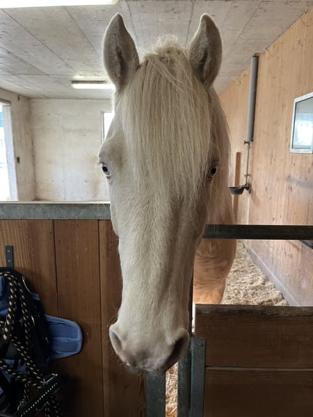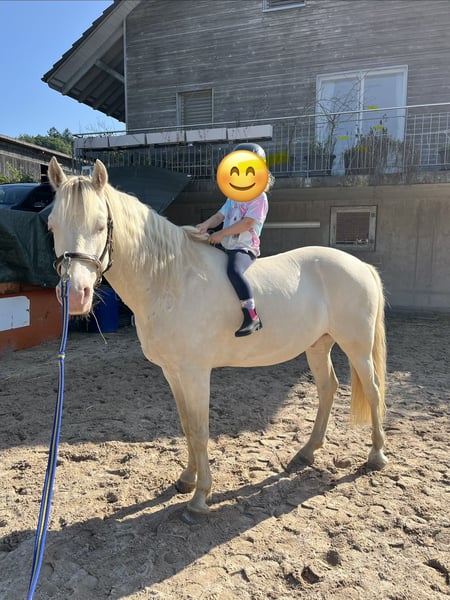 Wir verkaufen unseren Connemara Wallach, 6-jährig (im Juni 7), Stockmass 1.40 m, in der speziellen Fellfarbe Perlino. Tullo wurde direkt vom Züchter aus Irland in die Schweiz importiert, bevor er im April 2024 zu uns kam. Das Pony wurde schonend eingeritten und kennt Sattel, Zaum (gebisslos) und kann alle Gangarten. Er hört sehr gut auf die Stimme, auch beim Reiten. Im Umgang und bei allem, was dazugehört (Hufschmied, Tierarzt, verladen usw.), ist er absolut brav und unkompliziert. Er ist sehr gemütlich und nimmt es gerne ruhig. Tullo wird zurzeit im Offenstall gehalten, was sehr gut klappt und ihm gefällt. Er ist sehr lieb und hat einen ganz ruhigen Charakter. Zu Kindern ist er ebenfalls sehr fein und vorsichtig. Seit Dezember letzten Jahres zeigt der Connemara Wallach leider ein sehr auffälliges Verhalten. Beim Reiten, Longieren und Spazieren hält er seinen Kopf ab und zu in einer unnatürlichen Schieflage (Kopf nach links gekippt). Tullo wurde ausgiebig von Tierarzt, Chiropraktiker, Osteopathin und Tierheilpraktiker untersucht. Eine genaue Ursache für dieses Verhalten konnte bisher nicht gefunden werden. Er ist aktuell noch in Behandlung. Im Stall zeigt er dieses Verhalten nicht, sondern rennt und tobt mit seinen Pferdefreunden herum und ist glücklich. Wir verkaufen Tullo aufgrund der Auffälligkeiten als Beistellpferd und würden uns trotzdem freuen, wenn es mit dem neuen Besitzer als Freizeitpferd wieder klappen würde. Ebenfalls würde er sich aufgrund seines Charakters bestens als Therapiepferd eignen. Ein schönes Zuhause für Tullo ist uns sehr wichtig, daher ist der Verkaufspreis verhandelbar.