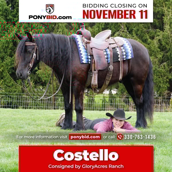 𝓽𝓱𝓮 𝐑𝐈𝐃𝐄𝐑'𝐒 𝓒𝓱𝓸𝓲𝓬𝓮 🐴 𝐏𝐎𝐍𝐘 𝐄𝐃𝐈𝐓𝐈𝐎𝐍 🐴 Happening now thru TUESDAY | NOVEMBER 11th - Available EXCLUSIVELY on Ponybid's website! For more details and to register visit: www.Ponybid.com CONSIGNOR CONTACT: GloryAcres Ranch 330-763-1436 LOCATION: Wooster Ohio BREED: Fell Pony REGISTERED: Yes REGISTERED NAME: Felllegend Costello COLOR: Black HEIGHT: 13.3 AGE: 4 GENDER: Gelding Costello is a 4 year old black fell pony gelding that is good broke to ride very calm and gentle and very teachable with great temperament. Loves attention and loves to please yet is athletic and very safe and sound .has been on trail rides with couple hundred horses rides good in arena and around the farm he is ready to go to whatever level you want to take him .has good barn manners and is great in pasture with other horses has been line driven, stands good for farrier. If you’re looking for a horse to have around for a long time that is fun and great to have around bee sure to check him out .for more info on to come meet him call Norman 330-763-1436