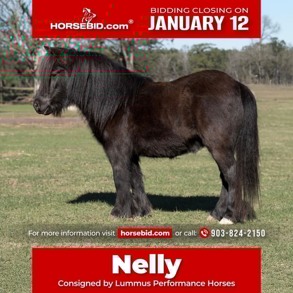 ♦️𝐍𝐄𝐖 𝐘𝐄𝐀𝐑'𝐒 𝑬𝒙𝒕𝒓𝒂𝒗𝒂𝒈𝒂𝒏𝒛𝒂♦️ Happening now thru MONDAY | JANUARY 12th - Available EXCLUSIVELY on HorseBid's website! For more details and to register visit: www.Horsebid.com CONSIGNOR CONTACT: Lummus Performance Horses 903-824-2150 LOCATION: Bloomburg, TX BREED: Fell Pony/Pony REGISTERED: No REGISTERED NAME: Nelly COLOR: Black HEIGHT: 42” AGE: 9 GENDER: Gelding “Nelly” is one of the most beautiful half-Fell ponies you’ll find. He is a 9-year-old black gelding, standing 42 inches tall, and he has all the looks and personality, just look at that mane and tail! Nelly is the barn favorite that everyone wants to ride and drive. He is wonderful with kids, loves to be groomed, and has no kick or bite. Truly a big horse trapped in a little horse’s body, Nelly has exceptional manners and a kind, willing attitude. He has been there and done that, both riding and driving. My 7-year-old can drive him anywhere, he has a nice trot that covers a lot of ground. Nelly is 100% gentle with ZERO buck. You can step on him on the coldest morning, even after a month off, and ask him to walk straight off or pick up a lope without hesitation. He is easy to handle and tack up, and under saddle he is an absolute blast. He will walk, trot, lope circles, and has a good stop. We’ve been roping the sled dummy on him and he is doing great. Nelly has been learning barrels, poles, goat tying, and excels at all of them. He goes wherever you point him, over jumps, through creeks, and down the trails. He will walk on a loose rein all day, confidently leading or following on the trail without a care. Nelly has drug logs and barrels, carried tarps, walked over them, and proudly carried the American flag. He’s had kids and dogs running all around him and never bats an eye. He has been hauled to ropings, barrel races, rodeos, jumped courses, worked cows, drug calves, hog hunted, swam ponds, and traveled through everything from thick brush to boggy creeks and down the road. Trains honking and passing don’t bother him at all. He has seen more country than most people! He even rides English, and my kids love jumping him. Both of my girls, ages 7 and 10, catch him by themselves, saddle and bridle him, and ride him everywhere with ZERO help from an adult. Nelly is truly the coolest little guy around, and everywhere we go he gets all the attention thanks to his sweet personality and stunning looks. He leads, loads, ties, bathes, and hauls like a pro. He gets along great with both big horses and minis. He is an easy keeper, and stays fat on air. Nelly is UTD on farrier, vaccinations, and deworming.