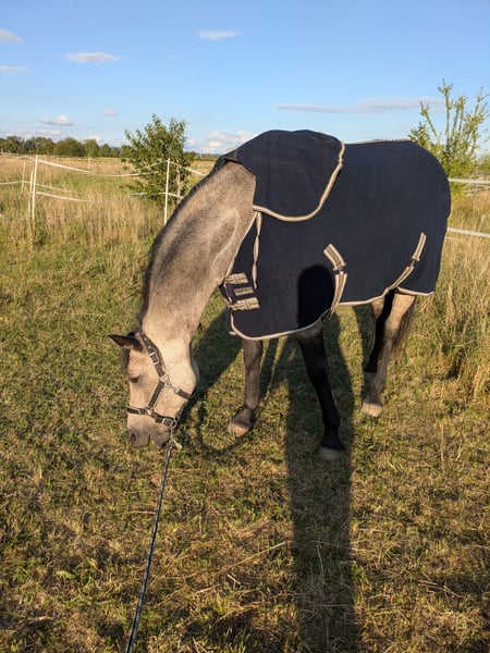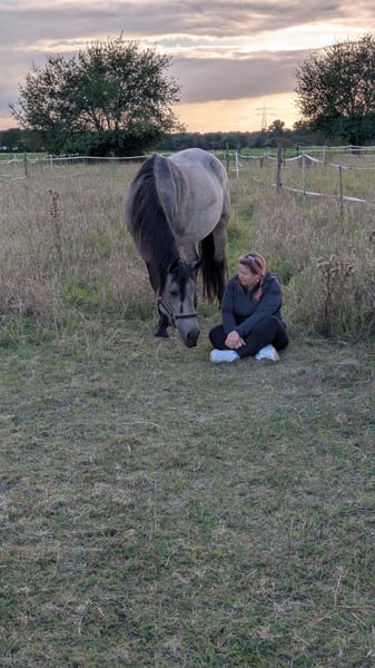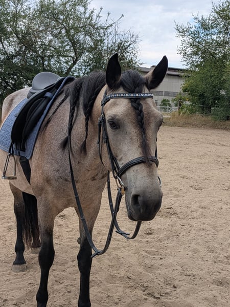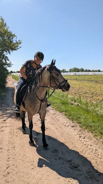 For sale is a beautiful and affectionate Island mix mare. She is incredibly gentle with children, very cuddly in general, and forms a close bond with her owners. Her temperament can be described as calm and balanced. Currently, she is ridden by my wife, daughter, and myself. We ride her English-style, as she was sold to us as an English-trained horse. However, recent signs suggest she may also have Western training, as she responds very well to Western aids, especially to the acoustic signals! She is absolutely safe in the terrain; she does not spook at large machinery or startled animals. The only thing she finds a bit strange are water sprinklers, but she calmly walks past them with gentle encouragement. She is sure-footed on all surfaces and is currently kept barefoot. She is a stunning buckskin mare, which appears lighter (amber-colored) in summer and turns more gray and dark gray in winter, with a face that almost resembles a raccoon's mask :-)
