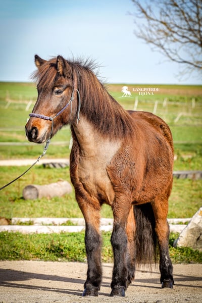 Glaera is a seasoned leisure horse who happily approaches each day with a cheerful spirit. She is open to all tasks and ideas her handler might have in mind and enjoys participating in shared activities. Age-appropriate, she brings life experience and demonstrates enthusiasm not only as a riding horse but also for circus tricks and tricks training. Her five gaits are easy to switch and well-separated. In a flowing tölt, she carries herself comfortably over rough terrain, even with loose reins. Her trot is secure, and her canter ranges from relaxed to well-sprung, as needed. She is also suitable for beginners' extended canter experiences, as she is easy to collect from the canter and the tölt is steady. Glaera has a classic Icelandic horse build, not tall but sturdy, with strong bones and tendons. She features a beautiful mare head and a gaze that’s simply captivating. Her movements are not overly high-stepping, making her exceptionally comfortable in all gaits. Character-wise, Glaera is a diligent horse who enjoys moving forward but remains sensible and easy to control. Standing still and waiting is no problem for her, even on the trail. She loves the outdoors, whether alone or in a group. She is also motivated and eager to work in the arena or on the riding track, always striving to please her rider. For us, she is the perfect horse for anyone seeking a cheerful five-gait horse with versatile training and experience. Ideal as a mother-daughter team, a school horse for advanced beginners, or simply for someone looking for an easy, experienced partner.