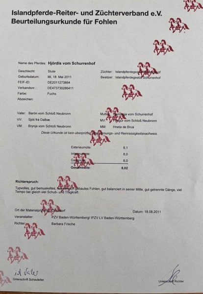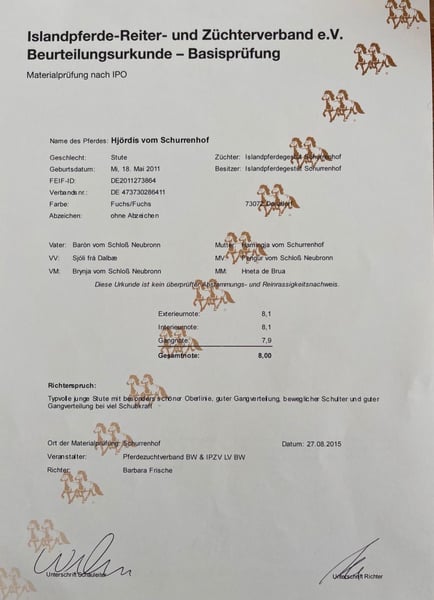We are parting ways with our Hjördis vom Schurrenhof due to lack of time and health issues on my part. Hjördis is 14 years old and has five clearly defined gaits. She exhibits significant tempo variation in tölt. In the indoor arena, she moves comfortably at slow to moderate speeds, and in the terrain, she tölt comfortably and effortlessly for the rider when the larger horses gallop. Hjördis is approximately 1.45 meters tall and covers very well. I am 1.73 meters tall. She was bred in Germany and has no eczema. Hjördis is very sensitive to ride and highly trained in dressage. Dressage work has always been very important to me. She is lunged without side reins (lunging as a dialogue based on osteodressage principles) and relaxes easily. She is also familiar with double longe, biotensegral training (fascia work), and ground work. She is very open to all kinds of exercises. She trots nicely over poles and can even jump over small cross rails. Hjördis has only recently joined us. I initially wanted her as my successor horse, but I find I do not have enough time for her, so we are looking for a good home. She moves effortlessly both indoors and on the round pen or in the terrain. Hjördis has always been manageable in the terrain, even for a child. At clinics and competitions, she is always relaxed and participates enthusiastically. Traveling with her in the trailer is so stress-free that I have sometimes gone alone with her. Hjördis has had two beautiful foals, and I could also see her in a breeding program. I wish for Hjördis to find a loving home with someone who enjoys spending time with her. A current health certificate (AKU) with no findings is available. If we have sparked your interest, please feel free to contact us. A trial ride is almost always possible.