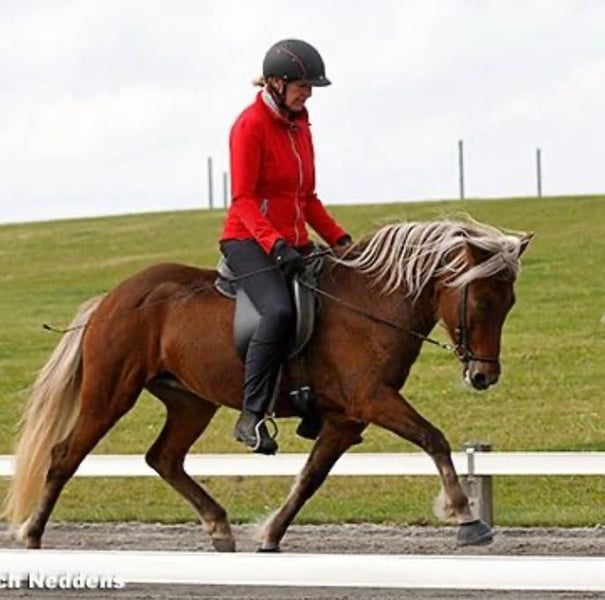 Description: Fjóla is currently seeking her "forever home." She is a wonderful, well-trained, and completely reliable five-gaited mare. Her proverbial "sewing machine trot" ensures an exceptionally comfortable riding experience. She was previously a successful competition horse in the five-gaited discipline and is now one of our most dependable school horses, as well as one of our absolute favorites. We are now looking for a new home where she can have a dedicated person or a loving family who will pamper her and provide her with a long-term, permanent place to live. Conformation: Fjola has a sturdy build and a solid physique. She is in good condition, well-fed, and well-cared for. Temperament: It is important to note that Fjola has a handicap: she has impaired vision in her left eye. However, this hardly affects her in daily riding. She can be ridden normally in the indoor arena, on the riding pad, and in the field. Only jumping and work over poles are not possible due to her limited vision. Gaits: As a large and strong five-gaited mare, Fjola has well-separated, expressive gaits. Her endless, very pleasant Tölt is particularly noteworthy—it can be ridden at a lively pace and provides a lot of riding fun. Training Level: Fjola is very well-trained and responds reliably to aids. Her previous competition experience in the five-gaited discipline and her many years as a dependable school horse make her very experienced and reassuring for riders. She can be ridden in all dressage gaits and works attentively with her rider. Who is she suitable for: Fjola is ideal for riders seeking a completely reliable horse with which they can relax and enjoy a brisk Tölt through the terrain. At the same time, she is suitable for riders who want to develop further in riding lessons, as she can be dressaged in all gaits. Due to her calm and dependable nature, Fjola is a horse for the whole family. Care Condition: She is in good condition, well-fed, and free of eczema. Other notes: It is important to know that Fjola has a handicap: she has impaired vision in her left eye. However, this hardly affects her in daily riding. She can be ridden normally in the indoor arena, on the riding pad, and in the field. Only jumping and pole work are not possible due to her limited vision. Besides Fjola, we also have many other horses for sale. Feel free to contact us to arrange a viewing – together, we will find the right horse for you!