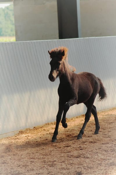 Beschreibung: Gabríela ist ein elegantes, großes und hübsches Rappstutfohlen, ihr Richterspruch lautet. Leichtfüßiges mittel gut aufgerichtetes Stutfohlen mit taktsicherem, fließendem Tölt bei mittleren, Bewegungen, taktsicherem Trab, etwas gelaufenem taktklarem Galopp sowie gelassenem, angenehmen Charakter. Ausbildungsstand: Fohlen ABC Vater: Gabríelas Vater Merkur ist ein bildschöner großer Fünfganghengst mit hoch-weiten Bewegungen. Er konnte bereits fünfjährig das Zuchtchampionat in Zachow gewinnen und überzeugte dann ein Jahr später noch mit seiner hohen FIZO, bei der er mit der Gesamtnote 8,34 (Gebäude 8,48 und Reiteigenschaften 8,24) Elite gesamt und in beiden Teilbereichen wurde. Sein liebevoller Charakter kombiniert mit seinem sehr guten Gebäude und seinem herausragenden Tölt, sieht man bereits in seinen Nachkommen. Merkur wurde sechsjährig von einem 13-jährigen Mädchen schon auf Turnier erfolgreich vorgestellt. Mutter: Gabríelas Mutter ist unsere junge Stute Gydja vom Kranichtal die wiederrum uns bekannten Kopernikus vom Heesberg abstammt. Pflegezustand: Gabríela erfreut sich bester Gesundheit. Sonstiges: Gabríelas ist, wie alle von Kranichtal gezüchteten Pferde, ekzemfrei und aus ekzemfreien Elternlininen. Gabríelas ist noch bei Fuss und kann ab dem 1.10.2025 abgesezt werden.