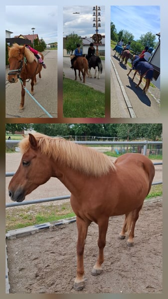 Gamma vom Nordlichthof Fuchsstute, Jg. 2005 Fünfgängig, mit gangsalat. Lieblingsgangart der pass bis hin zum Galopp, Galopp 5gängi gelaufen Stockmaß ca132cm Alter Schlag, deckt trotz ihrer Größe Erwachsene ab War bei ihrer vorbesitzerin (die leider verstorben ist) zuchtstute, bei mir führpferd und ausreitpferd, ist mit mir und auch mit meinen kindern 9 und 12 schreckfrei im Geländeunterwegs gewesen (u die freundinnen meiner kinder u meine nichten). Geht brav am strick u auch ohne neben dem Fahrrad Hab bei mir im erlebnisbauerhof mitgeholfen u war immer zuverlässig (kein reiten! Putzen u lieb haben) Kinder können problemlos hufe auskratzen u sie putzen Als führpferd ein Traum! Ekzem frei, Schmiedefromm/Verladefromm (allerdings das letzte mal vor 3 Jahren) Regelmäßig geimpft; Entwurmt Zähne kontrolliert Bei Interesse schicke ich Bilder u Videos Beim Vorgänger war sie auch allein im Gelände ich hab mich das nie getraut. Es fällt uns schwer sie her zu geben aber wir machen viel aufm reitplatz (wenn das Wetter es zulässt auf der koppel) u da sieht sie keinen Sinn. Definitiv nicht für dressur geeignet! Der 2 Grund ist das sie in der Rosse unseren wallach keine ruhe lässt. Sie wird nicht verschenkt