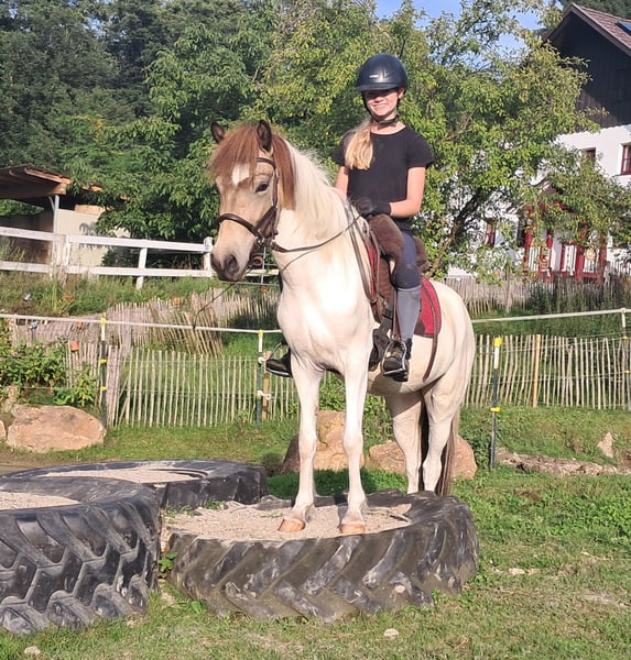 Cool, cooler, Fjalla! Bei dieser Ponystute geht jedem das Herz auf! Wunderschöne Farbe kombiniert mit Traumcharakter und fabelhaften, taktreinen Gängen, toller Tölt vorhanden auch unter dem Sattel. Ein Taumpony aus Deutschland absolut robust und ekzemfrei, bestens sozialisiert. Extrem cool und gelassen, für jeden Spaß zu haben, mit Familienanschluss aufgewachsen, liebe voll ausgebildet. Hufschmied, Anhänger fahren, alleine spazieren gehen ... alles kein Problem, nun bereit für die große weite Welt mit dir, Abstammungsnachweis vorhanden, vorbei komme und verlieben, aktuell 137 cm, 3 1/2 Jahre. Für Wander-, Gelände-, Freizeit und Therapiereiten. Englisch und Western ist beides möglich. Offenstall und Herdenhaltung gewöhnt, Box ist auch kein Problem. Equidenpass vorhanden. Alle unsere Pferde kennen Bodenarbeit, unterschiedliches Gelände, Autos, landwirtschaftliche Maschinen, sowie Kühe, Esel, Schafe, Schweine, Hunde, Katzen und Hühner. Infos und Terminabsprache unter 08536-2890292 (AB vorhanden) oder 0157-78378455 (am Hof kein Mobilnetz). Bitte keine PN, Mail und WhatsApp Anfragen!! Sonntag Ruhetag. Zubehör und Transport günstig möglich. Jedem Kunden wird ein vertraglich festgesetztes Umtauschrecht von 6 Wochen eingeräumt. Preise sind Festpreise. Keine Anfragen auf Ratenzahlung erwünscht. Wer gleich mit Anhänger kommt und mitnimmt erhält 100€ Rabatt. Bei Kauf werden 1000€ in bar als Anzahlung fällig. Wer das Pferd gleich mitnehmen will, muss selbstverständlich komplett bezahlen. Wir absolvieren mit den Kunden einen Ausritt mit zwei Pferden Eurer Wahl, damit Ihr Euer Traumpferd kennenlernen und prüfen könnt ob es das richtige Pferd für Euch ist. Jeder Termin kostet 35€, egal ob reiten, vorreiten, bereitstellen, spazieren ... jeder weitere Reiter (Freundin, Freund, Schwester, Trainer...) bezahlt das selbe wenn er mitreitet, nur mal schauen kostet uns auch Zeit und somit 20€. Der Betrag wird beim Kauf eines Pferdes am selben Tag wieder erstattet. Aufgrund mehrfacher Vorkommnisse bitten wir darum wahrheitsgemäße Angaben über das Reitergewicht zu machen. Bei nicht wahrheitsgemäßen Angaben behalten wir uns vor, uns vor Ort gegen einen Proberitt zu entscheiden. Unseren Pferden zu Liebe möchten wir auch unseren gut gebauten Pferden nicht mehr als 120kg zumuten. Da es sich hierbei um ein lebendes Tier handelt, sind dies lediglich Eindrücke des Betreuers und keine zugesicherten Eigenschaften des Pferdes. Weitere Pferde/Ponys in meinen anderen Anzeigen oder auf Anfrage